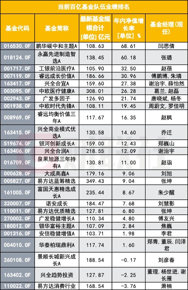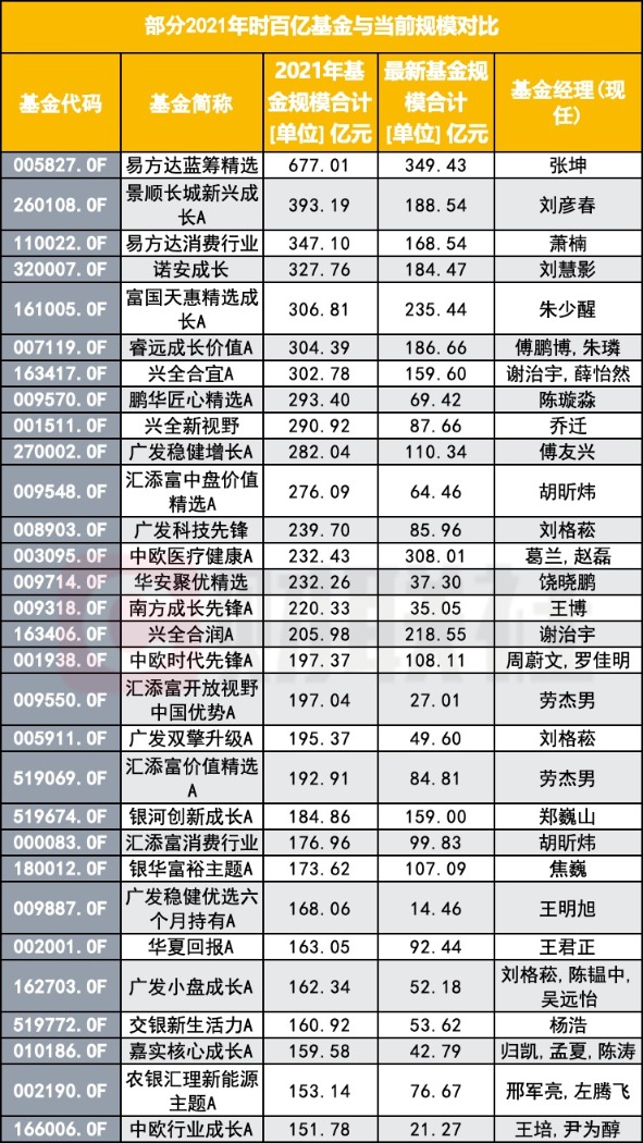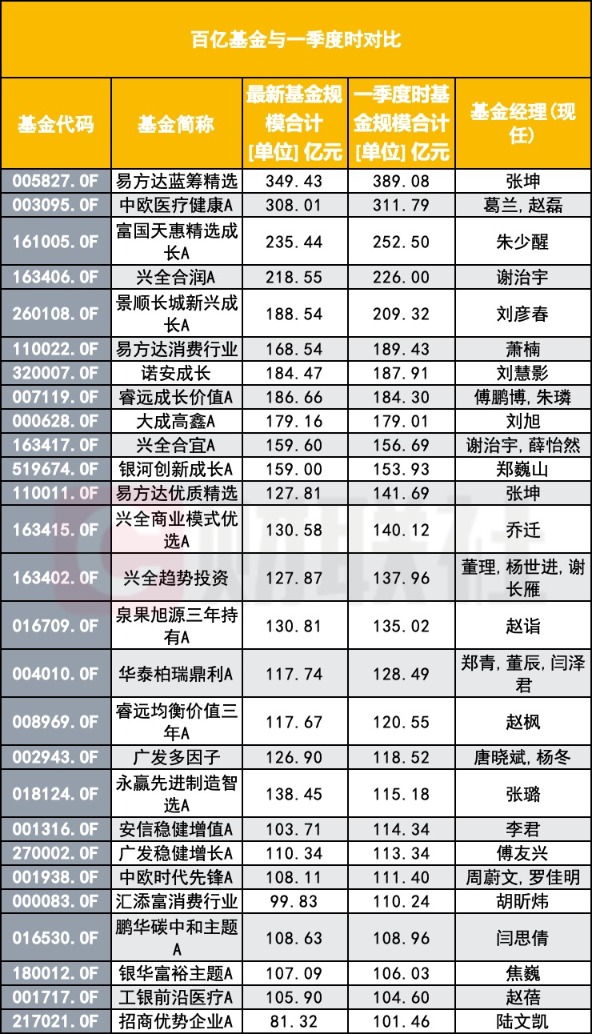 财联社8月15日讯(记者吴雨其)谁还在百亿阵营里?谁又悄然跌出榜单?Wind数据统计显示,截至二季度末,非货币型基金中共有277只产品跻身“百亿俱乐部”,相较年初进一步扩容,显示出资金对优质资产的持续追捧。其中,主动权益类基金共计25只产品仍然稳居百亿之上,虽较一季度略有回落,但整体维持高位运行。 与数量变化同样值得关注的,是这批百亿基金的构成变化。与2021年巅峰时期相比,当时共有71只主动权益基金规模超过百亿元,如今仅14只产品仍坚守百亿阵营。也就是说,57只基金在过去四年间“跌出”百亿门槛,显示出主动权益板块内部的一轮深度“换血”。 有不具名业内人士指出,主动权益基金作为“市场温度计”,其规模变动往往能折射出资金的风险偏好和主题偏移路径。“四年间的这场洗牌,更像是一次风格周期的缩影:从消费独秀到成长当道,从老将坚守到新人上位。” 百亿“黄金时代”谢幕,仅14只留守 时间回到2021年,主动权益基金正处在前所未有的高光时刻。当年年初,全市场共有71只主动权益基金规模超过百亿元,这一数据不仅是当时的历史高点,也标志着“爆款基金”与抱团交易共同催生出的阶段性繁荣。 然而,这样的繁荣未能延续。到了2025年中期,上述71只百亿主动权益产品中,仅有14只仍保有百亿规模,超过八成的昔日“巨无霸”产品已经退出百亿行列。与当前25只百亿基金名单对比,其中仅14只是从2021年延续至今,剩余11只为后续新晋的产品。 不少明星基金经理也经历了从“顶流”到回落的周期。张坤管理的易方达蓝筹精选在2021年初一度管理超670亿元,如今规模缩水至349.43亿元,不过位居主动权益基金规模首位,朱少醒的富国天惠精选成长的合计规模也从306.81亿元回落至235.44亿元。 部分基金在四年间维持住了百亿规模,如葛兰、赵磊管理的中欧医疗健康,2021年初规模为232.43亿元,当前最新规模为308.01亿元;谢治宇的兴全合润从205.99亿元增至218.55亿元。 更典型的则是那些“高位陨落”的产品。比如鹏华匠心精选曾在2021年初规模高达293.40亿元,如今已不足70亿元;汇添富中盘价值精选则从276.09亿元大幅缩水至64.46亿元;兴全新视野四年前规模290.92亿元,目前已不足88亿元;华安聚优精选和南方成长先锋也分别从超过230亿元和220亿元的规模,退步至当前的37亿元和35亿元。这些基金在四年间的迅速回落,既体现了主题风格退潮后的规模压力,也暴露出部分产品对市场切换的适应不足。 ![]() 与此同时,2021年之后至今有11只新产品跻身百亿阵营,其中多数产品具有明显的成长属性,重仓方向集中于医疗健康、先进制造、新能源与AI产业链等赛道。这些产品大多成立时间不长,却依靠显著的阶段性收益完成了从小规模到百亿体量的跨越,成为市场轮动与资金偏好的集中体现。 其中,大成高鑫在过去四年间的规模增长较多,从2021年的20.74亿元增长至当前的179.16亿元;广发多因子则从1.24亿元跃升至126.90亿元,增长125.66亿元;兴全商业模式优选从10.72亿元增长至130.58亿元。华泰柏瑞鼎利和安信稳健增值同样完成了百亿级别的突破,前者当前规模117.74亿元,后者为103.71亿元。 业内人士表示,从2021年至今,百亿基金的标准未变,但“上榜逻辑”已经发生变化。过去可借渠道助推与市场情绪冲规模,如今更需依靠持续的业绩表现与配置敏感度留住长期资金。在估值切换与风格震荡交替的市场中,唯有那些能够穿越周期、长期积累口碑的产品,才真正配得上“百亿”头衔。 二季度零晋级,两只基金跌出百亿阵营 从短周期来看,今年二季度主动权益百亿基金并未出现新增入列者,而是经历了一轮小幅出清。截至2025年一季度末,共有27只主动权益基金规模超过百亿元,到了二季度末,这一数字下降至25只,意味着有2只基金跌破百亿门槛。 这些跌出百亿的产品中,汇添富基金旗下的消费行业主题产品出现轻微规模回撤,由胡昕炜管理的汇添富消费行业基金在一季度末仍维持110亿元的体量,但二季度末规模缩减至99.83亿元,仅一步之差失守百亿红线。而招商基金的招商优势企业跌幅更为明显,从一季度末的101.46亿元下降至81.32亿元,显示出资金出逃的趋势。 ![]() 造成这些基金跌出的原因并不完全相同。汇添富消费行业所受影响,更多来自消费板块整体的持续疲软,使得原本稳定的资金池出现松动。而招商优势企业在主题偏好转移中难以突围,未能牢牢吸引新增申购。 业内人士表示,百亿基金的规模并非一劳永逸,尤其在市场震荡与热点频繁更替的背景下,一些边缘型产品若未能及时适应节奏,极易被市场淘汰出局。从渠道端反馈来看,当前投资者对基金的耐心正不断缩短,而对业绩、风控能力以及基金经理稳定性的考察愈加严苛。 百亿主动权益冷热分化,主题风口产品领涨 年内市场结构性机会频现,不同风格和行业主题的轮动使得主动权益类基金收益分布明显拉开。根据最新统计,在当前仍处百亿规模之上的25只主动权益基金中,年内收益率表现呈现强分化格局,涨幅前列的产品大多紧扣风口主题,展示出极强的弹性与成长力。 领涨者中,鹏华碳中和主题无疑最为抢眼,截至8月15日年内收益率已高达68.61%。该基金由闫思倩管理,产品规模也突破百亿元,达到108.63亿元。 紧随其后的则是张璐管理的永赢先进制造智选A,年内收益为60.18%,当前规模达到138.45亿元,显示其已不再是短期热点驱动