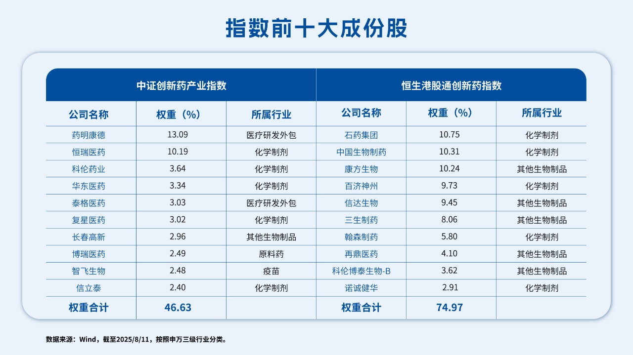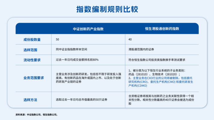 今年以来,创新药板块热度持续攀升,恒生港股通创新药指数、中证创新药产业指数等港股及A股市场的创新药相关指数纷纷走强。 都是创新药相关的指数,恒生港股通创新药指数和聚焦A股市场的中证创新药产业指数有什么区别? 编制规则有何不同? 先从选样范围来看,中证创新药产业指数聚焦A股创新药研发公司,从A股主营业务涉及创新药研发的上市公司股票中,选取不超过50只最具代表性的股票作为样本;恒生港股通创新药指数则聚焦港股通创新药公司,反映可经港股通买卖,业务与创新药研究、开发及生产相关的香港股票的表现。 此外,在具体的创新药业务范围要求、选样方法、成份股数量等方面,两只指数也有所不同。正如下表所示,恒生港股通创新药指数在8月11日修订生效的编制方案中,明确剔除了医药外包公司(即CXO),并且会按照上市公司与创新药业务的相关性分数进行选样;而中证创新药产业指数不剔除医药外包公司,会在符合选样要求的股票里选市值最大的50只作为样本。 那么,什么是医药外包公司?在创新药产业链中,不同类型的公司基于自身资源禀赋和能力积累,会选择差异化的价值获取路径。例如,生物科技类公司通常专注于前沿技术和突破性创新,在研发环节扮演关键角色;医药外包公司则主要提供药物发现、商业化生产等外包服务,其核心价值在于专业化分工带来的效率提升、规模效应导致的成本降低以及经验积累形成的质量保障。 ![]() 由于恒生港股通创新药指数明确剔除了医药外包公司,因此该指数和中证创新药产业指数在行业分布方面也存在明显差异。 按照申万三级行业分类,中证创新药产业指数的前三大权重行业分别为化学制剂、医疗研发外包和其他生物制品,分别占比46.6%、21.3%和15.2%;而恒生港股通创新药指数则主要侧重于化学制剂和其他生物制品,分别占比48.9%、41.1%。 其中,化学制剂属于“化学药”,主要通过化学合成的方式生产,多为小分子药物,技术壁垒相对较低;其他生物制品则属于“生物药”,主要借助生物技术,多为大分子药物,相对于化学药,生物药的研发周期更久、技术壁垒更高;医疗研发外包即前文所说的“医药外包”。 简单做个总结,这两只指数的化学药占比相当,生物药在恒生港股通创新药指数中的比重更高,中证创新药产业指数覆盖了医药外包这一细分行业、而恒生港股通创新药指数则明确剔除了这一类。 ![]() 再从成份股集中度看,恒生港股通创新药指数的集中度更高,前十大权重股合计占比约为75%;中证创新药产业指数的成份股更分散,前十大成份股合计占比不到50%。 具体来看,中证创新药产业指数中,药明康德为第一大成份股,主要提供医药外包服务,权重超13%;其次为恒瑞医药,权重超10%;其余成份股权重均在5%以下。 而恒生港股通创新药指数中,石药集团、中国生物制药权重均超10%,此外还汇聚了更多生物科技公司,如康方生物、信达生物等,权重也都在10%左右。 从成份股市值来看,恒生港股通创新药指数既有百济神州、翰森制药等千亿市值以上的龙头企业,也有百亿市值以下的中小药企;而中证创新药产业指数中,除了恒瑞医药、药明康德等大家熟知的巨头以外,其余成份股市值也都在百亿以上。 ![]() 目前,市场上有恒生创新药ETF(159316)、创新药ETF易方达(516080)等产品分别跟踪这两只指数。 ![]() ![]() |