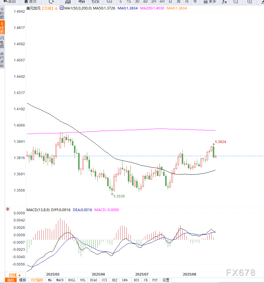 美元兑加元在周一亚洲时段维持弱势。该货币对在上周五大跌约0.8%后,目前在1.3820附近挣扎寻求支撑。美元受美联储鸽派言论拖累,而加元则因市场对本周加拿大GDP数据的期待而获得支撑。 ![]() 加拿大经济数据或决定加元走势。市场预计加拿大6月GDP增长0.1%,扭转5月的萎缩局面,若数据好于预期,加元有望进一步走强。除加拿大数据外,本周美国将公布耐用品订单和7月核心PCE物价指数,这些数据可能成为影响美元走势的关键。 从日线图来看,美元兑加元在1.3850附近遇阻后回落。下方初步支撑位在1.3800,若跌破则可能进一步下探至1.3740一线。上方阻力位在1.3880—1.3900区域,若突破该区间,则有望恢复上行趋势。 当前均线走势显示该货币对处于震荡整理阶段,短期方向取决于本周关键数据表现。 ![]() 美元兑加元的走势正处于美联储政策预期与加拿大经济表现的双重影响下。鲍威尔的鸽派立场短期压制美元,而加拿大GDP数据若优于预期,可能进一步强化加元的支撑。 相反,若美国耐用品订单或PCE数据表现强劲,美元可能阶段性反弹。整体来看,短期USD/CAD倾向震荡下行,但波动可能因数据而加剧。 |