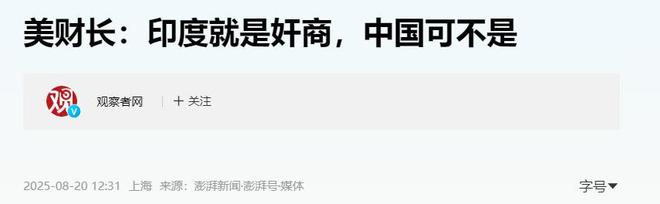 而印度呢?2022年之前仅有1%的石油来自俄罗斯,如今这个比例飙升到了42%。贝森特的逻辑很简单:中国的增长是"正常需求",印度的暴增明显是在"趁火打劫"。 表面看起来挺有道理,但这套说辞经不起推敲。真正的原因,藏在贝森特的另一番话里。同样在19日,他对中美贸易现状做了个点评,称中国目前是美国"关税收入中最大的来源"。