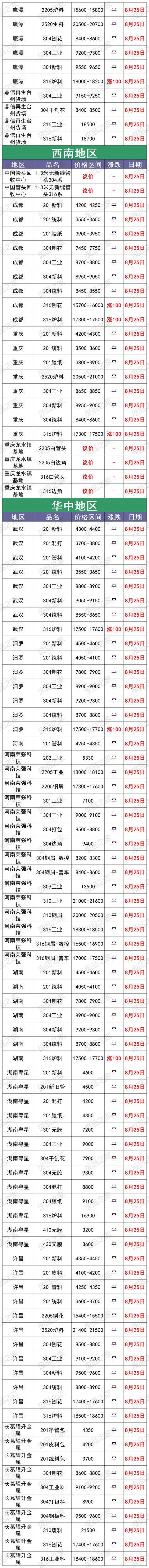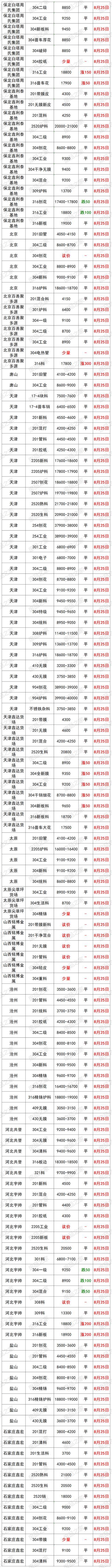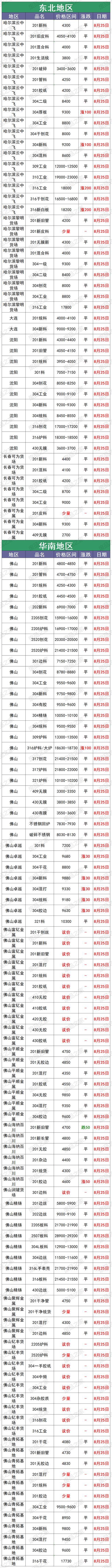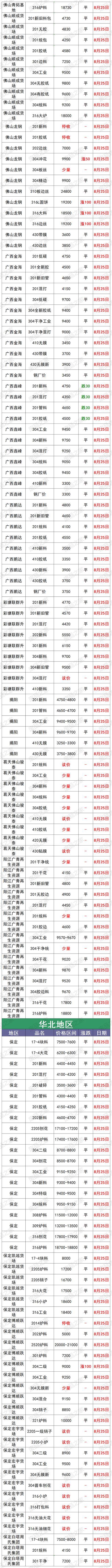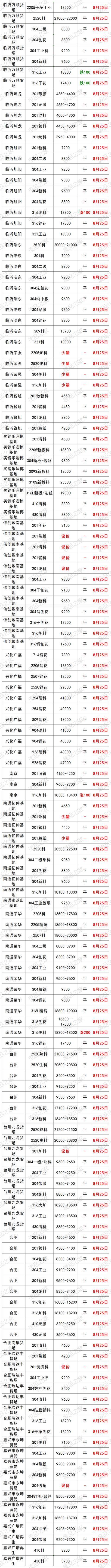 最新8月25日全国不锈钢基地货场废料调价信息汇总 华北地区 8月25日起,天津鑫达货场不锈钢调价: 【304】新花片、边丝9650 新(碎片料、歺具料、喉箍料)9550 新纯膜料9350 净重工业料9200 混合料(旧胶纸)9050 二级料8900(无生活料) 生活料8700(无杂) 破碎料8800(无杂) 【304】细销8700(10吨以上8750,20吨以上8800) 干普销8800 钢销9400 【304】水箱11400 【304】电热管3200 【304】金钢网4100 【304】油葫芦7500 【321】干净工业料10000 【308】块料11400(镍11,铬20) 【2014】熟料13500(镍13,铬22) 验出201按3000元/吨、验出爆炸物、铁扣 【301】新电子料7200 工业料、新杂料7000 钢销6600 【镍4】炉料4800、新料5000、销4500 【17—4】新料8300、块料7100、普车销6200,厚销6400 【316壹吨以上】新花板18700 干净罐皮18600 工业料18500 生料18400(没分割18000) 细销17400 干普销17500 钢销17600(10镍2钼) 【316水箱壹吨以上】16600 定货以微信订单确认为准,切割加工费200元一300元/吨 【2205壹吨以上】新板料18400 新管18200 工业料17800 钢销17100 普销17000 【2520壹吨以上】生料20800 熟料(轻微烧板)21600 新板料23600 普车销19000 厚销19200(镍19,铬23) 验出304按8000元/吨,验出201和铁扣 【201】新花片、边丝4600 新碎片料4550(无油、无膜) 新旧管4500(无铁、杂) 新膜料4300 混合料(管料占10%、无生活料)4250 混合料(有管料、生活料占比10%)4200 干净生活料3900 净销3850 净破碎料3900(无杂) 【431】新料3850 销3750 【441】新料3900 有膜料3800 【430】新料3800 有膜料3700 干净工业料3550 无油无杂销3250 【410】新料3250 有膜料3150 干净工业料3000 无油无杂销2850 不锈铁净生活料2300 铬锰胆3800 铁铬铝3900(铬20) 定货以微信订单确认为准,切割加工费200元一300元/吨 8月25日起,河北石家庄不锈钢基地调价: 大量采购铬锰4200 铁铬铝3850 高锰钢 201清料4600 201膜料管料4300—4500 201混打料3800—4200 5成以上管料无生活料4250 201干净生活料3700 201销子3900(cr+Mn=22) 201破碎料3900 410干刨花2700 410膜料和新料2900—3000 430干净工业料3500 430膜料和新料3700—3800 高价采购铬锰氮4250 采购一批铁铬铝3600—3900量大价格高有货电话联系 17—4块料7000 17—4销子6000 304一级/清料:9300量大加价9500 304工业料:9200; 304混打料:9100; 304二级料:9000; 304刨花(无油无水):8600-9100; 316销子17200—17600 316块料18400 2520销18000 2520生料20500 2520熟料21000 2520白料23000 (货到付款,现金自提) (以上报价,量大加价) 地址:河北石家庄藁城区 西南地区 8月25日起,重庆铬行商贸有限公司不锈钢调价: 410/409<铬13>2400-2750元/吨 430<铬17>3280-3680元/吨 地址:重庆大渡口跳蹬小南海温泉门口 8月25日起,重庆市场废不锈钢价格汇总:201新料4200-4300元/吨,304新料8950-9050元/吨,316炉料17300-17500元/吨,较上一交易日涨100元/吨。单位:元/吨。 华南地区 8月25日起,广东佛山市场废不锈钢价格汇总:304新料9750-9800元/吨,316炉料18630-18730元/吨,较上一交易日涨100元/吨,201新料4800-4850元/吨,430新料3800-3850元/吨。 8月25日起,广东佛山卓越废不锈钢调价: 304新料:9880 304白工业料9680 304纯胶边9630 304厂工业料9580 304杂胶边工业料9480 304混打料9330 304干净统料9180 304干刨花8800 301料7200 321料10300 304/301金刚网5000 201料现余采购 201无胶边料4800 201新长管料4750 201干净新旧管料4700 201胶纸边料4550 201混打料杂边板4400 201干净统料4300 不锈铁2800 注:304挑出来的密封气一律当201料结算 华东地区 8月25日起,上海市场废不锈钢价格汇总:201管料4200元/吨,304一级料9600-9700元/吨,304二级料8650-8750元/吨,316炉料18400-18500元/吨,较上一交易日涨100。单位:元/吨。 8月25日起,山东临沂市场废不锈钢价格汇总:201新料4500-4550元/吨,304新料9500-9600元/吨,316炉料18600-18700元/吨,430新料主流3750-3850元/吨。 8月25日起,伟创再生江苏戴南基地不锈钢调价: 304特级料:9750 304新料:9650 304工业料贴膜:9300 304二级料杂料:9150 304刨花:8700 304锯沫:7700 304油沫子:7500 304法兰钢削:9200 304黄刨花:9100 316新料:18500 316工业料:18300 316刨花:17200 316钢刨花:17600 309炉料:13800 309刨花:12800 2507炉料:18100 2507刨花:17800 2205清料:15800 2205刨花:15300 310炉料:22000 310刨花:21000 301炉料:7000 201刨花:3100 地址:戴南镇中迎工业区泰富路 8月25日起,山东临沂旭阳废不锈钢调价: 304工业料9200元/吨 304二级料8800元/吨 304带膜料量大9300元/吨 304新料9600元/吨 301新料7200 301胶纸料7100 304钢花8800元/吨 321工业料10000 316废料18800元 316钢花17300 2205工业料17000 2205刨花16500 309工业料13800 所有货量大可以再议价! 地址1:山东省临沂市华东金属城金梅街5-7号 地址2:淄博市淄川区205国道与将军路交汇处往东 东北地区 8月25日起,辽宁沈阳市场废不锈钢价格汇总:201新料4300—4400元/吨,304新料9200—9300元/吨,316炉料18300—18500元/吨。 华中地区 8月25日起,河南许昌市场废不锈钢价格汇总:201新料4350—4450元/吨,304新料9500—9600元/吨,316炉料18500—18600元/吨。 8月25日起,湖南市场废不锈钢价格汇总:201新料4500-4600元/吨,304新料9200-9300元/吨,316炉料17500-17600元/吨,较上一交易日涨100元/吨。单位:元/吨。 8月25日废不锈钢价格汇总 |