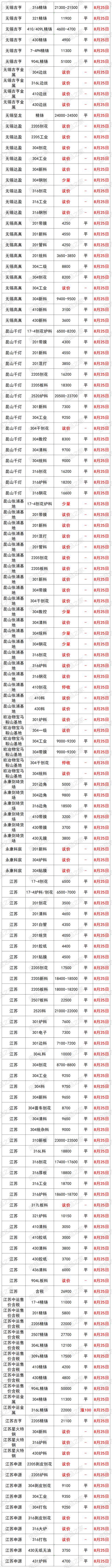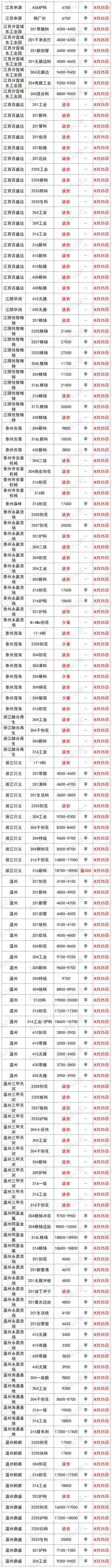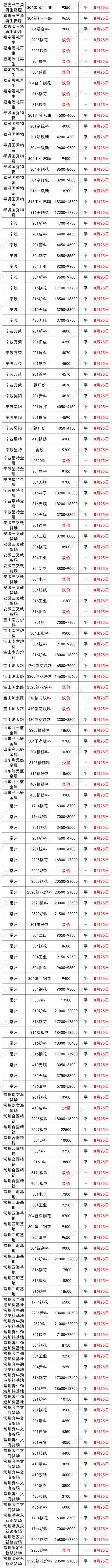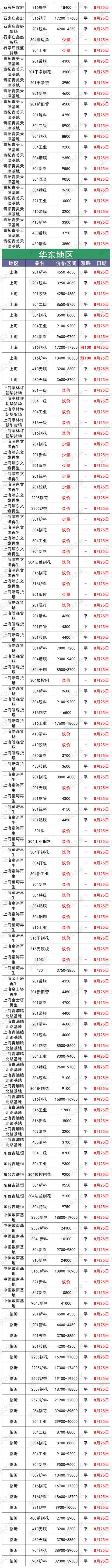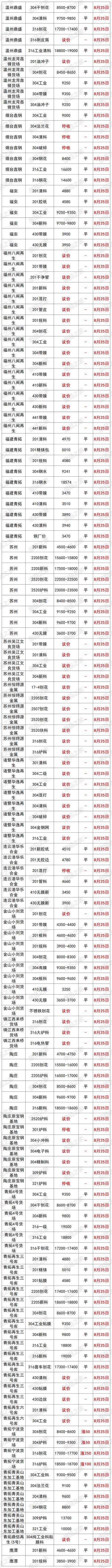 最新8月25日全国不锈钢基地货场废料调价信息汇总 华北地区 8月25日起,天津鑫达货场不锈钢调价: 【304】新花片、边丝9650 新(碎片料、歺具料、喉箍料)9550 新纯膜料9350 净重工业料9200 混合料(旧胶纸)9050 二级料8900(无生活料) 生活料8700(无杂) 破碎料8800(无杂) 【304】细销8700(10吨以上8750,20吨以上8800) 干普销8800 钢销9400 【304】水箱11400 【304】电热管3200 【304】金钢网4100 【304】油葫芦7500 【321】干净工业料10000 【308】块料11400(镍11,铬20) 【2014】熟料13500(镍13,铬22) 验出201按3000元/吨、验出爆炸物、铁扣 【301】新电子料7200 工业料、新杂料7000 钢销6600 【镍4】炉料4800、新料5000、销4500 【17—4】新料8300、块料7100、普车销6200,厚销6400 【316壹吨以上】新花板18700 干净罐皮18600 工业料18500 生料18400(没分割18000) 细销17400 干普销17500 钢销17600(10镍2钼) 【316水箱壹吨以上】16600 定货以微信订单确认为准,切割加工费200元一300元/吨 【2205壹吨以上】新板料18400 新管18200 工业料17800 钢销17100 普销17000 【2520壹吨以上】生料20800 熟料(轻微烧板)21600 新板料23600 普车销19000 厚销19200(镍19,铬23) 验出304按8000元/吨,验出201和铁扣 【201】新花片、边丝4600 新碎片料4550(无油、无膜) 新旧管4500(无铁、杂) 新膜料4300 混合料(管料占10%、无生活料)4250 混合料(有管料、生活料占比10%)4200 干净生活料3900 净销3850 净破碎料3900(无杂) 【431】新料3850 销3750 【441】新料3900 有膜料3800 【430】新料3800 有膜料3700 干净工业料3550 无油无杂销3250 【410】新料3250 有膜料3150 干净工业料3000 无油无杂销2850 不锈铁净生活料2300 铬锰胆3800 铁铬铝3900(铬20) 定货以微信订单确认为准,切割加工费200元一300元/吨 8月25日起,河北石家庄不锈钢基地调价: 大量采购铬锰4200 铁铬铝3850 高锰钢 201清料4600 201膜料管料4300—4500 201混打料3800—4200 5成以上管料无生活料4250 201干净生活料3700 201销子3900(cr+Mn=22) 201破碎料3900 410干刨花2700 410膜料和新料2900—3000 430干净工业料3500 430膜料和新料3700—3800 高价采购铬锰氮4250 采购一批铁铬铝3600—3900量大价格高有货电话联系 17—4块料7000 17—4销子6000 304一级/清料:9300量大加价9500 304工业料:9200; 304混打料:9100; 304二级料:9000; 304刨花(无油无水):8600-9100; 316销子17200—17600 316块料18400 2520销18000 2520生料20500 2520熟料21000 2520白料23000 (货到付款,现金自提) (以上报价,量大加价) 地址:河北石家庄藁城区 西南地区 8月25日起,重庆铬行商贸有限公司不锈钢调价: 410/409<铬13>2400-2750元/吨 430<铬17>3280-3680元/吨 地址:重庆大渡口跳蹬小南海温泉门口 8月25日起,重庆市场废不锈钢价格汇总:201新料4200-4300元/吨,304新料8950-9050元/吨,316炉料17300-17500元/吨,较上一交易日涨100元/吨。单位:元/吨。 华南地区 8月25日起,广东佛山市场废不锈钢价格汇总:304新料9750-9800元/吨,316炉料18630-18730元/吨,较上一交易日涨100元/吨,201新料4800-4850元/吨,430新料3800-3850元/吨。 8月25日起,广东佛山卓越废不锈钢调价: 304新料:9880 304白工业料9680 304纯胶边9630 304厂工业料9580 304杂胶边工业料9480 304混打料9330 304干净统料9180 304干刨花8800 301料7200 321料10300 304/301金刚网5000 201料现余采购 201无胶边料4800 201新长管料4750 201干净新旧管料4700 201胶纸边料4550 201混打料杂边板4400 201干净统料4300 不锈铁2800 注:304挑出来的密封气一律当201料结算 华东地区 8月25日起,上海市场废不锈钢价格汇总:201管料4200元/吨,304一级料9600-9700元/吨,304二级料8650-8750元/吨,316炉料18400-18500元/吨,较上一交易日涨100。单位:元/吨。 8月25日起,山东临沂市场废不锈钢价格汇总:201新料4500-4550元/吨,304新料9500-9600元/吨,316炉料18600-18700元/吨,430新料主流3750-3850元/吨。 8月25日起,伟创再生江苏戴南基地不锈钢调价: 304特级料:9750 304新料:9650 304工业料贴膜:9300 304二级料杂料:9150 304刨花:8700 304锯沫:7700 304油沫子:7500 304法兰钢削:9200 304黄刨花:9100 316新料:18500 316工业料:18300 316刨花:17200 316钢刨花:17600 309炉料:13800 309刨花:12800 2507炉料:18100 2507刨花:17800 2205清料:15800 2205刨花:15300 310炉料:22000 310刨花:21000 301炉料:7000 201刨花:3100 地址:戴南镇中迎工业区泰富路 8月25日起,山东临沂旭阳废不锈钢调价: 304工业料9200元/吨 304二级料8800元/吨 304带膜料量大9300元/吨 304新料9600元/吨 301新料7200 301胶纸料7100 304钢花8800元/吨 321工业料10000 316废料18800元 316钢花17300 2205工业料17000 2205刨花16500 309工业料13800 所有货量大可以再议价! 地址1:山东省临沂市华东金属城金梅街5-7号 地址2:淄博市淄川区205国道与将军路交汇处往东 东北地区 8月25日起,辽宁沈阳市场废不锈钢价格汇总:201新料4300—4400元/吨,304新料9200—9300元/吨,316炉料18300—18500元/吨。 华中地区 8月25日起,河南许昌市场废不锈钢价格汇总:201新料4350—4450元/吨,304新料9500—9600元/吨,316炉料18500—18600元/吨。 8月25日起,湖南市场废不锈钢价格汇总:201新料4500-4600元/吨,304新料9200-9300元/吨,316炉料17500-17600元/吨,较上一交易日涨100元/吨。单位:元/吨。 8月25日废不锈钢价格汇总 |