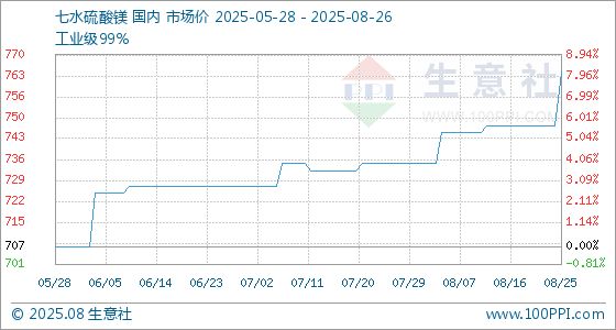 8月26日,生意社七水硫酸镁基准价为765.00元/吨,与本月初(735.00元/吨)相比,上涨了4.08%。