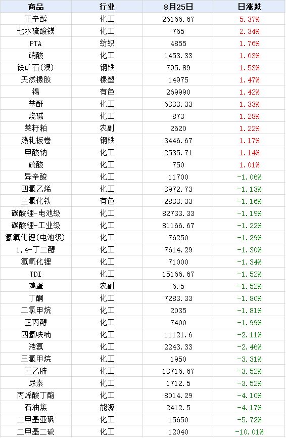 【大宗商品涨跌日榜】 据生意社价格监测,2025年8月25日大宗商品价格涨跌榜中环比上升的商品共56种,集中在化工板块(共23种)和钢铁板块(共9种),涨幅在5%以上的商品主要集中在化工板块;涨幅前3的商品分别为正辛醇(5.37%)、七水硫酸镁(2.34%)、PTA(1.76%)。 环比下降的商品共49种,集中在化工(共34种)和农副(共4种),跌幅在5%以上的商品主要集中在化工板块;跌幅前3的商品分别为二甲基二硫(-10.01%)、二甲基亚砜(-5.72%)、石油焦(-4.17%)。