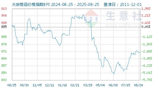 【大宗商品价格指数】 8月25日大宗商品价格指数BPI为871点, 较昨日上升了1点 , 较周期内最高点1343点(2021-10-19)下降了35.15%,较2016年02月03日最低点660点上涨了31.97%。