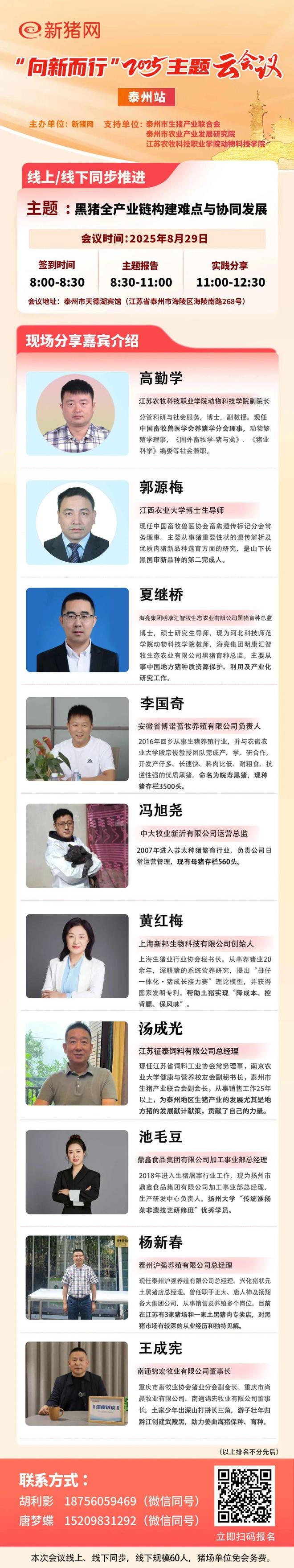 新猪网 支持单位 泰州市生猪产业联合会 泰州市农业产业发展研究院 江苏农牧科技职业学院动物科技学院 技术支持单位 江苏征泰饲料有限公司 上海新邦生物科技有限公司 上海邦成生物工程有限公司 江苏乐聚医药科技有限公司 江苏富泰净化科技股份有限公司 扬州市牧新自动化设备有限公司 福建倍思达生物有限公司 (持续诚邀中...) 企业参会名录 (以下企业排名不分先后) 江苏姜曲海种业有限公司 光明农牧科技有限公司 海亮集团明康汇智慧牧业有限公司 江苏厚文农牧科技有限公司 河南省谊发牧业有限责任公司 安徽省博诺畜牧养殖有限公司 南通锦宏牧业有限公司 南通霖音畜禽有限公司 南京楚香和康农牧有限公司 扬州峰达农牧有限公司 江苏征泰饲料有限公司 上海新邦生物科技有限公司 扬州市牧新自动化设备有限公司 泰州沪强养殖有限公司 泰兴市永和家庭农场 厚文达康种业有限公司 泰兴市安雅生物科技有限公司 庐江县五公山畜禽养殖有限公司 庐江县博诺畜牧养殖有限公司 扬州市鼎鑫食品集团有限公司 泰州市姜堰区伦强养猪专业合作社 江苏乐聚医药科技有限公司 上海禾丰饲料有限公司 泰州正大饲料有限公司 江苏弘泰农业科技有限公司 成都史纪生物制药有限公司 山东临沂中慧同盛公司 南京宝辉生物饲料有限公司 南通味鲜屾农业科技有限公司 河南德华捷康农牧有限公司 济南中牧澳利生物科技有限责任公司 淮安淮润农牧科技有限公司 易衡生物技术(蚌埠)有限公司 上海邦成生物工程有限公司 金华熊猫猪猪两头乌产业发展有限公司 上海佳牧生物制品有限公司 江苏牧之友生物科技有限公司 常州市舜溪畜牧科技有限公司 中大牧业新沂有限公司 江西山下种猪繁育养殖有限公司 如皋市骏诚生态农业科技发展有限公司 泰州市林源牧业有限公司 上海明珠湖肉食品有限公司 福建倍思达生物有限公司 沭阳清美畜禽有限公司 丰禾泰晛生物科技有限公司 江西嘉博生物工程有限公司 本标科技有限公司 连云港以智正合咨询服务有限公司 江苏黑猪哥生态农业发展有限公司 丹阳市秉礼堂现代农业发展有限公司 正大预混料有限公司 上海家育汇康智能科技有限公司 南通佰诺农牧科技有限公司 泰州市姜堰区富康生猪养殖场 (持续更新中......) 会议时间 2025年8月29日(周五)上午 主题报告:8:30-11:00 实践分享:11:00-12:30 会议地点 江苏·泰州 泰州市天德湖宾馆(地址:江苏省泰州市海陵区海陵南路268号) 会议主题 黑猪全产业链构建难点与协同发展 会议内容 议题1:猪种保护——好品种怎么不消失? 议题2:绿色养猪——如何又省钱又环保? 议题3:屠宰加工——三线城市怎么解决冷链短板? 议题4:品牌营销——如何让消费者愿意多掏钱? 议题5:政策与金融——养殖户贷款难怎么破? 议题6:全链融合——一二三产怎么联动赚钱? 议题7:泰州路径——本地黑猪产业如何突围? 议题8:抱团发展——成立产业联盟 分享嘉宾