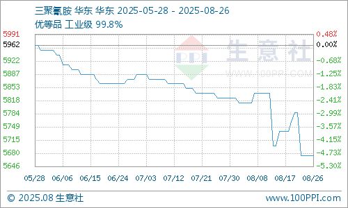 生意社08月26日讯 截止8月26日,生意社三聚氰胺基准价为5675.00元/吨,与本月初(5825.00元/吨)相比,下降了2.58%,呈现短期回调态势。
