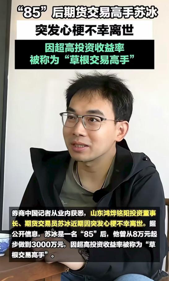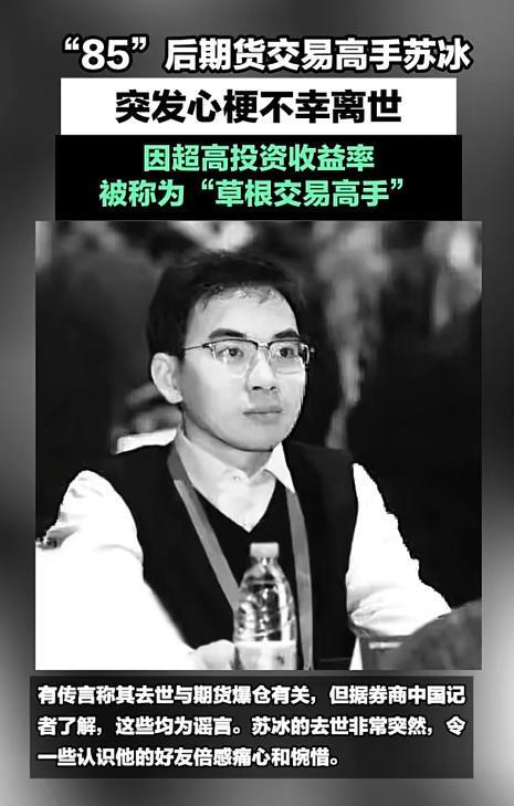 天妒英才,年纪轻轻就这么突然离世了,再多的名利都没用。 最近,期货高手苏冰的死讯被确认,令人痛心不已。 更令人惋惜的是他的死因,如此年轻就丢下妻儿走了……