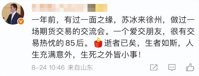 而在2年前,苏冰还是接触了互联网,在网上分享一些期货的知识。 可惜这个账号苏冰并没有坚持做下去,今年就没再更新了。 但是没想到再看到苏冰的消息,竟然是他已经去世了。