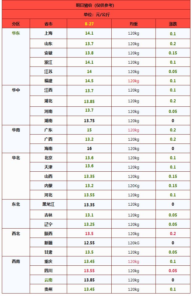 进入8月下旬,由于学生返校在即,升学宴增多,消费跟进缓慢回升,市场情绪略有改善,部分头部猪企短暂出现缩量情绪,猪价止跌上涨!可惜,猪价反弹幅度有限,短暂缩量出栏后,由于供应压力较大,市场认卖情绪再次转强,最近两日,猪价再次下跌! 目前,生猪市场多空并存,产销市场呈现“双增”的局面,短期内,猪价或将维持底部拉锯的走势,市场仍处于“筑底”阶段! 利好因素:一方面,政策性猪肉收储重启,猪粮比跌破6:1,官方稳价的信号明显,这或将缓解市场恐慌抛售的心态,避免猪价过度下跌;另一方面,消费需求支撑逐步转强,处暑节气后,北方地区大部退出高温,居民家庭购销需求或将改善,且,学生即将开学,下游市场备货需求增加,餐饮以及堂食需求改善,主流屠企订单量增加,需求承接能力转强! 利空因素:一方面,生猪供应格局宽松,虽然,中大猪存栏减少,标肥猪价有所走扩,大猪价格上涨,这提振了部分养殖户压栏信心。但是,由于去年底母猪存栏处于高位,本月标猪供应能力充沛,且,在官方调控下,养殖端压栏增重意愿不高,集团猪企积极降体重,适重中小标猪供应压力较大!尤其是,下一个国内生猪跨区调运更加严格,部分地区,养殖端存在提前出栏的现象;另一方面,需求跟进支撑有限,尤其是,传统销区高温持续,中东地区受副高影响,短期内将延续炎热天气,屠企订单 进一步增加受阻,需求对于猪源承接能力有限。叠加,官方不鼓励二育,二育入场积极性不高! 因此,在多空博弈下,目前,市场情绪转弱,从屠企汇总报价了解,受供需变化,预计,8月27日,外三元瘦肉型生猪价格在13.72元/公斤,后市关注集团猪企出栏节奏的变化! 国内南北各省区生猪价格一览表: