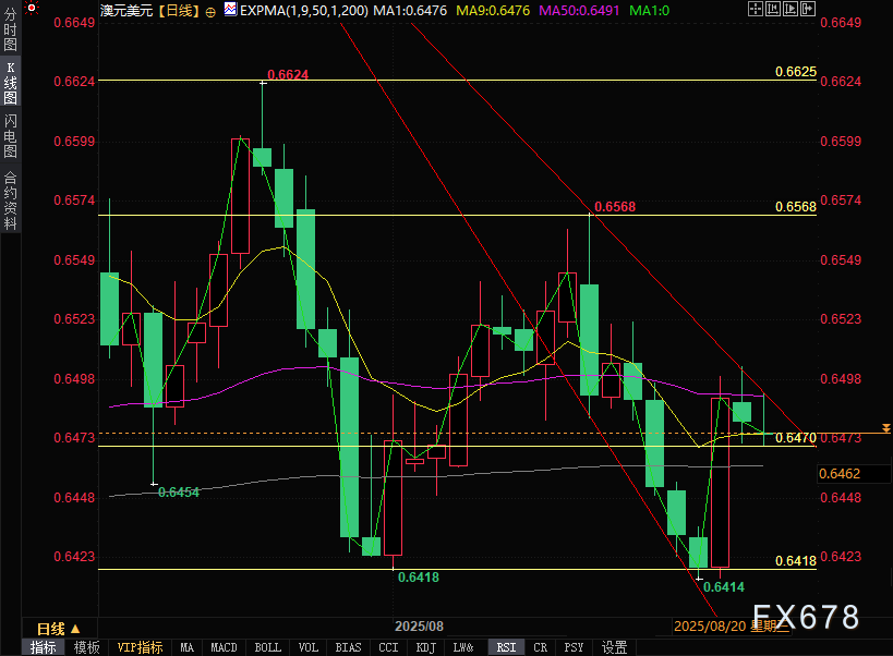澳元兑美元周二(8月26日)窄幅震荡,目前交投于0.6480附近。由于美国总统特朗普警告称若中国拒绝向美国供应稀土磁铁,将对中国商品征收200%关税,澳元兑美元持续承压。值得关注的是,中澳作为紧密的贸易伙伴,中国经济形势的任何变化都可能对澳元产生影响。 ![]() 美元指数(DXY)同样面临压力,美国总统特朗普解除美联储理事库克职务后,市场对美联储独立性的担忧持续发酵。特朗普于周二早间在社交媒体发布声明,宣布解除库克在美联储董事会的职务,此举将使特朗普得以提名继任者,从而加强对美联储政策走向的控制。 避险情绪下澳元依然承压 美元指数周二早盘一度下跌0.3%,至98.09,但目前震荡回升至98.35附近,跌幅约0.08%。交易商正等待即将公布的美国第二季度国内生产总值年化数据以及7月个人消费支出价格指数。 据彭博社报道,特朗普总统威胁将对先进技术和半导体征收“后续附加关税”并实施出口限制,以报复针对美国科技公司的数字服务税。 美联储主席鲍威尔上周五在杰克逊霍尔研讨会上表示,就业市场风险正在上升,但同时也指出通胀仍是威胁,且政策决定尚未最终确定。鲍威尔还强调,美联储仍认为不必仅基于就业可能超过最大可持续水平的不确定预测就收紧政策。 截至8月16日当周,美国初请失业金人数升至23.5万,创八周新高且高于共识预测的22.5万,表明劳动力市场状况出现疲软迹象。 强劲的PMI数据与上升的失业金申领人数形成鲜明对比,凸显美联储在权衡持续通胀压力与劳动力市场疲软证据方面面临的挑战。根据CME FedWatch工具,联邦基金期货交易员目前预计9月降息概率为74%,较周三的82%有所下降。 芝加哥联储主席古尔斯比上周四表示,9月美联储会议仍可能采取行动。他进一步指出,美联储近期收到的经济信号好坏参半。波士顿联储主席柯林斯则表示对9月降息持开放态度,理由是关税逆风和潜在劳动力市场疲软,尽管短期通胀风险依然存在。 标普全球美国综合PMI初值在8月加速至55.4,前值为55.1。与此同时,美国制造业PMI从前值49.8升至53.3,远超市场预期的49.5。服务业PMI从55.7放缓至55.4,但仍强于54.2的预期值。 后市展望 澳元兑美元的短期走势,将很大程度上取决于多方因素的博弈结果。市场对美联储降息的预期与对澳洲联储未来降息幅度的预期之间的较量,即将公布的澳大利亚7月CPI数据3以及美国的PCE通胀数据等,中美贸易关系的进展以及全球经济增长前景的变化等,都对澳元兑美元后续走势具备显著影响。 技术分析 日线图技术分析显示,澳元兑美元正尝试突破下降通道形态,暗示可能从看跌转向看涨趋势。 汇价目前位于九日指数移动平均线(EMA)(0.6476)上方,表明短期价格动能增强。 上行方面,澳元兑美元正在测试0.6590附近(下降通道上轨与50日指数移动平均线0.6491交汇处)的即时阻力区域。若成功突破该关键阻力带,将确认看涨趋势转换,推动汇价上探8月14日创下的月内高点0.6568,继而挑战7月24日创下的九个月峰值0.6625。 下行方面,澳元兑美元或将在九日指数移动平均线0.6476处获得初步支撑。跌破该水平将削弱短期价格动能,令汇价承压下行并下探8月21日录得的两个月低点0.6414。若继续下跌,将在6月23日触及的三个月低点0.6372(与下降通道下轨重合)附近获得支撑。 ![]() 北京时间14:37,澳元兑美元交投于0.6480/81。 |