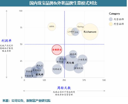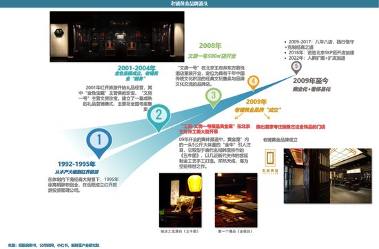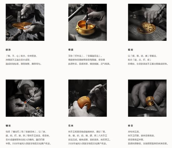 这一套典雅的品牌调性一直传承到了现在。走进老铺会发现,它的主色调不是一般的金色,它的看起来更厚重、更有历史感,像是在故宫或是博物馆看到的感觉。老铺的产品、门店、服务规划是有文化体系的,可以明显感受到一整套有辨识性的设计。徐总自己也曾提到“老铺黄金的基因根植于中国传统文化之中”。 2009年,依托于北京高地的“文房一号”,徐总正式开始老铺黄金的品牌化之路。就像黑蚁资本何愚所说的:‘高端品牌的建立,需要针对高净值人群,体系化地构建产品、内容、渠道和服务。这种以文化为核心的体系建设是非常难的,过去国内也鲜有案例。打磨这么一套体系更需要的是克制和定力。’ 拿老铺来讲,他们只选择最好的渠道,不去中低端商场。比如上海这么大市场,老铺一直只有豫园一家店。他们坚持没有合适铺位就不开,然后为此等了十多年。2009-2017年,老铺黄金只开了八家店。八年八店在以门店为驱动的生意模式中是非常罕见的。这可以被解读为定力。 老铺运作高端品牌自上而下的经营框架是自洽且恪守的,除产品工艺认可度高外,老铺采用了纯直营扩张方式,保证了总部的强管控。现阶段已经自发形成了老铺的回收体系,老铺的产品比传统的回收金价保值率有优势,可以类比奢侈品的中古市场。 2.“古法黄金”的故事属于老铺 古法工艺,其实并非老铺的独创,简单来说是一种传承中国传统宫廷造金工艺的加工方法,包括花丝、錾刻、鎏金、烧蓝等一系列复杂工艺,由于部分加工步骤需要熟练工匠手工制作,因此古法工艺通常较代工模式批量生产的传统金饰更为耗时,但独特性更强。非标意味着同质化程度低,就可以讲出不一样的故事。 老铺在官网写着‘老铺黄金创立于2009年,是我国率先推广古法黄金概念的品牌,也是我国古法手工金器第一品牌’。老铺的底气一是老铺自诞生以来全系列采用古法黄金工艺,二是老铺在美学高度、细节上始终追求极致。