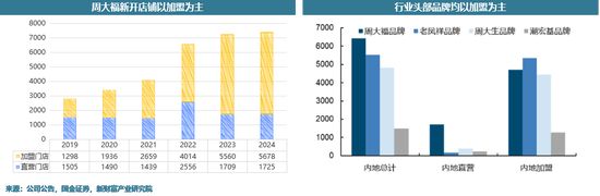 01 卖的是“古法黄金”、赚的是品牌溢价 黄金一直是中国珠宝首饰市场里最“工具型”的商品。大家买黄金,是为了保值、收藏、嫁妆,功能属性远远大于情感属性。 黄金作为贵金属,由于统购的存在,原材料成本主打一个公开透明。成本透明、各家工艺款式也是你中有我、我中有你。因此,以往二十年金饰首饰大多采用“克重+加工费模式”。 在消费者眼里,黄金品牌更像是加工师傅,管你是哪个周,结果都一样,都只是周师傅。所以有价值的是金子,而不是你周师傅。 在中国黄金消费沸腾的前20年里,黄金伴随着经济发展,共经历过三次高速发展期。早期的周大福们为了稳住品牌形象,也是坚持以直营模式缓慢拓店。然而,周大福自己下场开店的速度,远远跟不上“大妈们买金如买菜”的脚步。2013年的抢金潮以直营为主的周大福们市场份额被早早开放加盟经营的老凤祥抢占。于是,焦虑的周大福们开始褪下直营的包袱,开放加盟合作。据数据统计,2018-2023年,行业主要黄金门店数量从2800家增至近8000家,加盟门店数量占比高达76.5%。