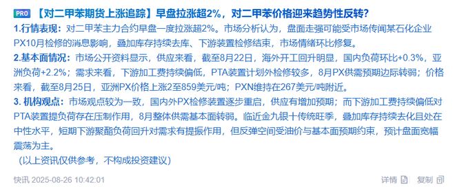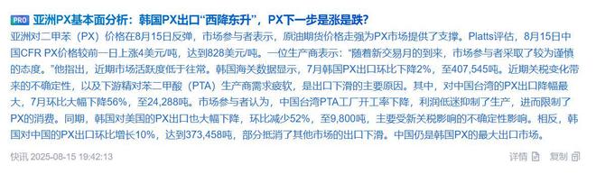 8月15日,金十期货快讯Pro提及,对于当天对二甲苯(PX )价格反弹,市场分析认为,原油期货价格走强为主要推手。