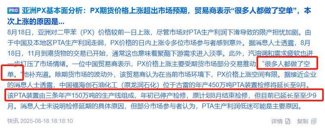 8月18日,对二甲苯(PX )价格再度上涨,此次上涨超出了市场上大部分贸易商的预期,金十期货快讯Pro提及, 据消息人士透露,中国福海创石油化工(原龙润石化)位于古雷的年产450万吨PTA装置检修将延长至9月。该PTA装置由三条年产150万吨的生产线组成,年初已停产检修,原计划8月结束检修,但目前已延长至至少9月。