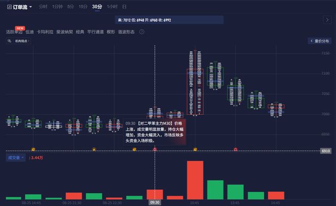如何把握今日行情起点并捕捉交易机会? 在今日对二甲苯(PX )价格上涨之初,9:23,金十期货量价策略提示, 对二甲苯主力合约30分钟价格上涨,成交量明显放量,持仓大幅增加,资金大幅流入,市场反映多头资金入场积极。 10:00后价格开始逐步拉升,最高触及7154元/吨。