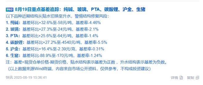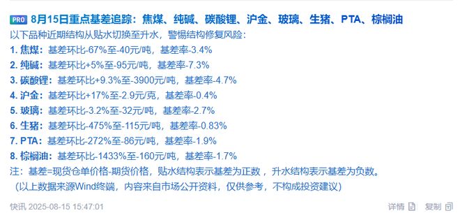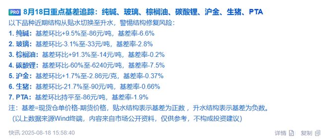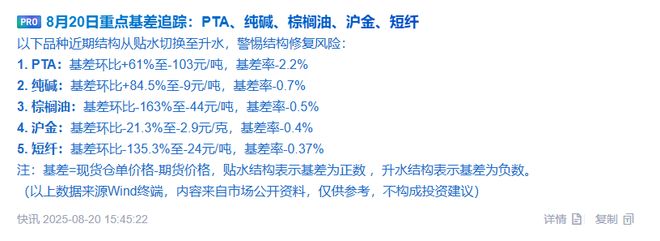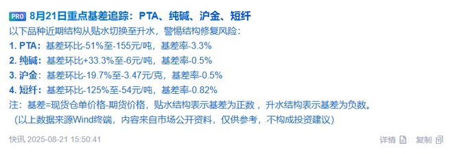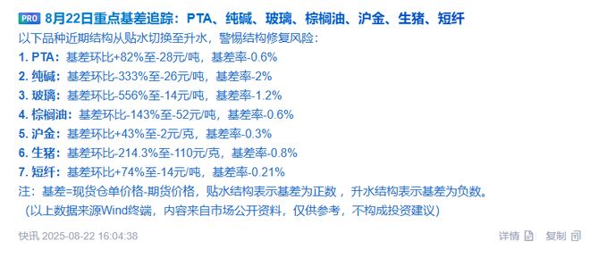 金十期货快讯Pro每日基差动态,助力交易者把握投资机会! 需要特别留意的是,金十期货快讯Pro自8月15日开始,连续六天提示,PTA基差处于异常贴水状态,后市基差可能会收敛,从而支撑期货价格,需要注意未来价格上涨风险。