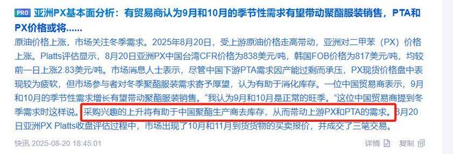 8月20日,对二甲苯(PX )价格再度扩大涨幅, 金十期货快讯Pro当天提及, 有贸易商认为9月和10月的季节性需求有望带动聚酯服装销售,采购兴趣的上升将有助于中国聚酯生产商去库存,从而带动上游PX和PTA的需求。