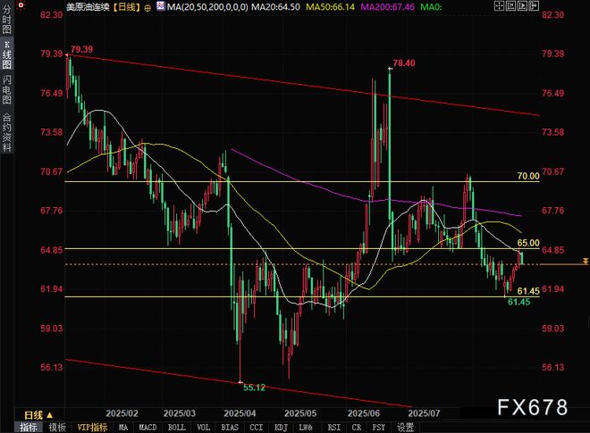 本周一原油价格上涨是由于对供应中断的担忧,因乌克兰袭击俄罗斯能源基础设施,且交易员预期美国将对俄罗斯石油实施更多制裁。 特朗普总统重申其威胁,称如果未来两周在和平协议方面没有进展,将对俄罗斯实施制裁。 市场还将关注美国对持续购买俄罗斯石油的印度征收关税的影响。在美国安全部门证实华盛顿对所有印度原产商品加征25%的关税后,印度出口商正准备应对贸易中断。 美国原油库存数据将于本周三公布,上周库存大幅下降后,将为需求前景提供更多线索。 投资者还将关注周二晚些时候公布的美国经济数据,包括耐用品订单和消费者信心指数,以寻找美国经济健康状况的线索。疲弱的数据可能加剧对增长前景的担忧,拉低原油价格。 技术分析 油价呈看跌态势,已跌破64.00整数位心理关口,处于下降趋势线及20日SMA(简单移动均线)(64.50)、50日SMA(66.14)和200日SMA(67.46)下方。 上行方面,尽管价格近期从61.45低点反弹,但在20日均线所在的64.50阻力位遇阻回落。若有效突破20日均线及65.00整数关口,则可能上探200日均线所在的67.46。若能站上70.00关口,将形成阶段性新高格局。 下行方面,若跌破61.45和60.00支撑位,可能推动油价下探2025年低点55.50。