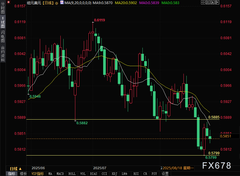 纽元兑美元正在回吐此前涨幅,从周一(8月25日)0.5880高位回落后,重返0.5800区间低位,交投于0.5840附近。由于特朗普试图罢免美联储理事库克,市场避险情绪升温,令风险敏感型货币纽元承压。 ![]() 对美联储独立性的质疑或拖累美元走势 过去数月间,特朗普持续抨击美联储并施压降息。这场侵蚀美联储独立性信心的博弈最新进展,可能长远动摇美元作为储备货币的地位。 目前纽元兑美元仍维持在上周交易区间中段。美元指数(DXY)周二亚市早盘一度下跌0.30%,至98.09,但目前在市场情绪恶化背景下从周初低点反弹,震荡回升至98.40附近。 新西兰周一公布的数据显示,今年第二季度零售销售表现优于预期。这些数据凸显出经济的韧性,缓解了上周新西兰联储鸽派货币政策声明带来的部分压力。 技术分析 从技术角度看,纽元兑美元目前处于关键位置: 下行方面,汇价在0.5800水平附近似乎找到短期支撑,该水平接近今年4月以来的也是近期的低点。 上行方面,近期汇价尝试反弹,但整体仍承压于9日简单移动平均线(SMA)(0.5870)关键阻力下方,如果突破该阻力位,还需克服20日简单移动平均线(0.5902)阻力位才能打开更多反弹空间。 新加坡大华银行(UOB)的分析师认为,纽元兑美元在进一步盘整之前,有测试0.5885的空间。他们指出,纽元似乎已进入一个区间交易阶段,短期内可能在0.5820至0.5920之间波动。 ![]() 后市展望 短期内,纽元兑美元走势可能继续受以下因素影响: 美联储与新西兰联储的政策存在差异,两国央行的货币政策分歧仍是该货币对变动的主导因素。 全球贸易格局变动及市场避险情绪的变化会影响纽元需求。 北京时间16:48,纽元兑美元交投于0.5839/40。 |