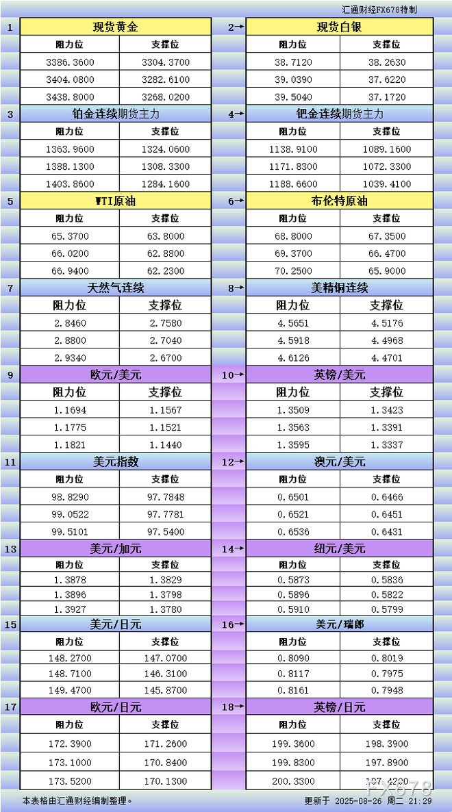 汇通财经讯——8月26日美市更新的黄金、白银、铂金、钯金、原油、天然气、铜(商品)以及:美元指数、欧元、英镑、日元、瑞郎、澳元、加元、纽元(热门货币对)的支撑阻力位一览。 汇通财经APP讯——8月26日美市更新的黄金、白银、铂金、钯金、原油、天然气、铜(商品)以及:美元指数、欧元、英镑、日元、瑞郎、澳元、加元、纽元(热门货币对)的支撑阻力位一览。