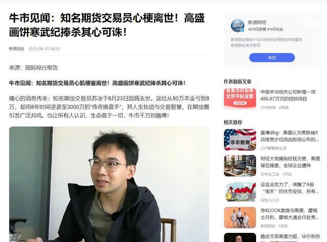 苏冰离世体现的行业工作强度 2025年8月的这个夏天,苏冰的离世像一颗投入湖面的石子,在期货圈激起层层涟漪。 消息传开后,各种猜测随之而来,有人传言他因爆仓压力过大,但知情人士很快澄清,他去世前交易状态稳定,并无重大风险事件,真正的杀手是突发心梗。 这个结论让业内人唏嘘不已,在这个每天都有人因为行情波动"心梗"的行业,最终真的有人倒在了生理心梗上。