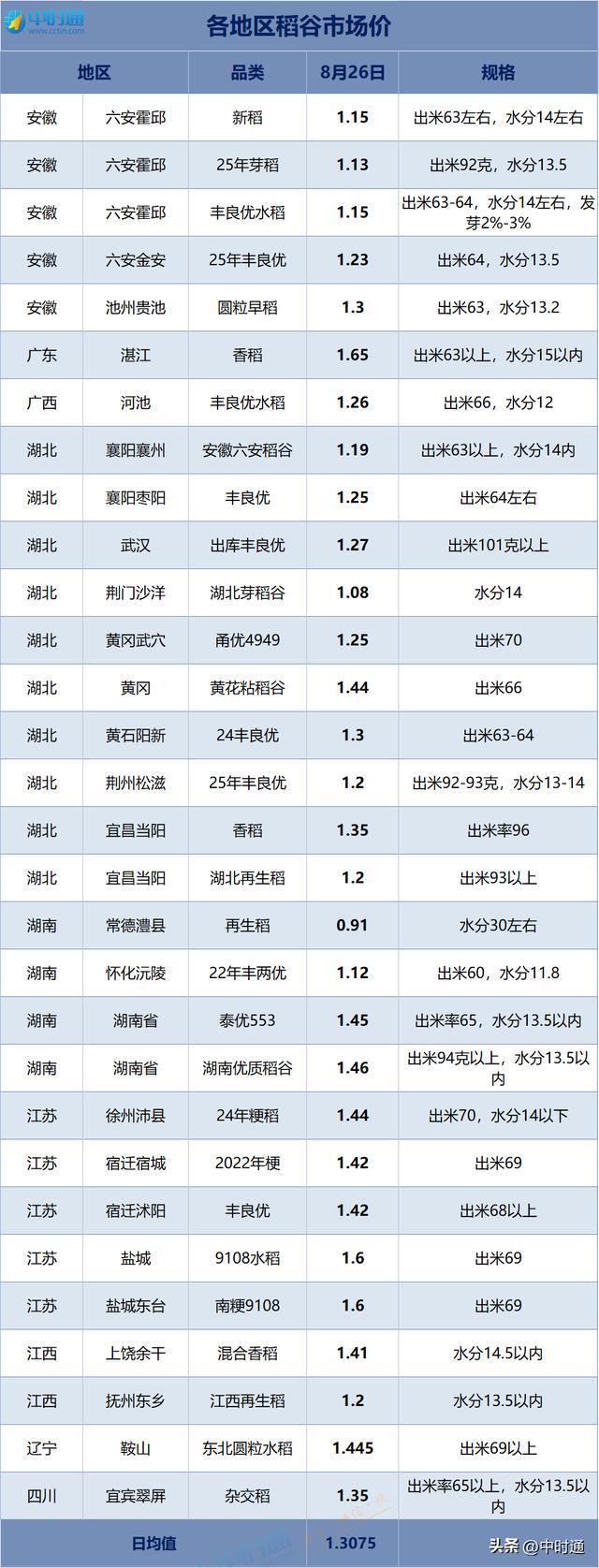 稻谷市场整体呈现供需博弈下的稳中偏弱格局,市场购销活跃度不高。 供应方面,早稻收购已近尾声,农户售粮积极性增强,市场粮源供应总体充裕。但政策性稻谷销售成交率偏低,反映出市场对现有库存消化动力不足; 需求端表现依然疲软,虽然开学季临近带动部分备货需求,大米走货略有加快,但整体提振有限,加工企业开机率维持低位,终端消费未见明显好转; 政策层面继续发挥托底效应,但短期内未有新的调控举措出台,市场仍由供需基本面主导。此外,国际大米价格持续低位运行,一定程度上加剧了国内供应压力。 综合来看,稻谷市场在新粮大规模上市前预计延续主流稳定、局部窄幅调整的走势,后续需重点关注中晚稻产量形势、政策性收购动态及进出口贸易变化。 安徽六安霍邱 - 新稻,出米63左右,水分14左右,价格1.15 安徽六安霍邱 - 25年芽稻,出米92克,水分13.5,价格1.13 安徽六安霍邱 - 丰良优水稻,出米63-64,水分14左右,发芽2%-3%,价格1.15 安徽六安金安 - 25年丰良优,出米64,水分13.5,价格1.23 安徽池州贵池 - 圆粒早稻,出米63,水分13.2,价格1.3 广东湛江 - 香稻,出米63以上,水分15以内,价格1.65 广西河池 - 丰良优水稻,出米66,水分12,价格1.26 湖北襄阳襄州 - 安徽六安稻谷,出米63以上,水分14内,价格1.19 湖北襄阳枣阳 - 丰良优,出米64左右,价格1.25 湖北武汉 - 出库丰良优,出米101克以上,价格1.27 湖北荆门沙洋 - 湖北芽稻谷,水分14,价格1.08 湖北黄冈武穴 - 甬优4949,出米70,价格1.25 湖北黄冈 - 黄花粘稻谷,出米66,价格1.44 湖北黄石阳新 - 24丰良优,出米63-64,价格1.3 湖北荆州松滋 - 25年丰良优,出米92-93克,水分13-14,价格1.2 湖北宜昌当阳 - 香稻,出米率96,价格1.35 湖北宜昌当阳 - 湖北再生稻,出米93以上,价格1.2 湖南常德澧县 - 再生稻,水分30左右,价格0.91 湖南怀化沅陵 - 22年丰两优,出米60,水分11.8,价格1.12 湖南湖南省 - 泰优553,出米率65,水分13.5以内,价格1.45 湖南湖南省 - 湖南优质稻谷,出米94克以上,水分13.5以内,价格1.46 江苏徐州沛县 - 24年粳稻,出米70,水分14以下,价格1.44 江苏宿迁宿城 - 2022年梗,出米69,价格1.42 江苏宿迁沭阳 - 丰良优,出米68以上,价格1.42 江苏盐城 - 9108水稻,出米69,价格1.6 江苏盐城东台 - 南粳9108,出米69,价格1.6 江西上饶余干 - 混合香稻,水分14.5以内,价格1.41 江西抚州东乡 - 江西再生稻,水分13.5以内,价格1.2 辽宁鞍山 - 东北圆粒水稻,出米69以上,价格1.445 四川宜宾翠屏 - 杂交稻,出米率65以上,水分13.5以内,价格1.35 |