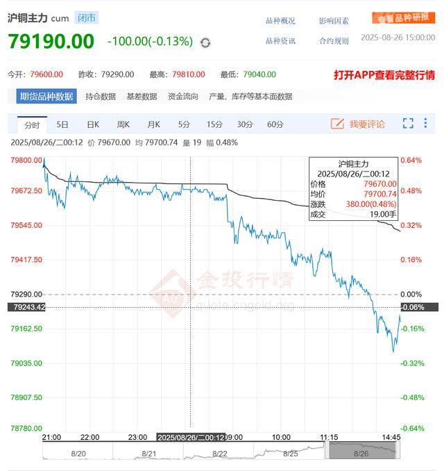 2025年8月26日沪铜主力最新价格及行情:期现联动走弱,跨市场分化加剧。 沪铜主力合约走势 8月26日,沪铜主力合约(CU888)呈现“高开低走、震荡收跌”态势,当日开盘价79600元/吨,高开190元/吨,但随后受宏观情绪及技术面抛压影响持续回落,盘中最低触及79040元/吨,最终收盘价79690元/吨,较前一交易日下跌100元/吨,跌幅0.13%。全天振幅达770元/吨(0.97%),成交量环比萎缩12%,显示多空双方在79500元/吨一线博弈加剧,短期市场情绪偏向谨慎。 国内股市联动(8月5日数据) A股铜产业链上市公司表现分化,具体呈现以下特征: 领涨标的:金田股份(601609)强势上涨4.98%,收报13.27元,创本月最大单日涨幅,主要受其新能源汽车用铜材订单超预期驱动;北方铜业(000737)同步上涨1.52%,报12.69元,受益于区域冶炼企业产能利用率提升。 领跌标的:铜冠铜箔(301217)领跌板块,收报33.85元,下跌4.92%,公司公告上半年净利润同比下滑12%;铜牛信息(300895)下跌3.34%,脱离基本面的概念炒作退潮导致股价回调。 行业龙头:江西铜业(600362)微跌0.52%,铜陵有色(000630)微涨0.91%,显示大盘股抗跌性强于中小市值标的。 跨境市场表现 港股:江西铜业股份(00358)逆势上涨2.50%,收报21.280港元,AH溢价率收窄至12%,吸引南下资金净买入3200万港元。 美股:南方铜业(SCCO)收报97.010美元,下跌0.54%,受美元指数反弹及伦铜库存增加拖累。 国际期货:COMEX铜合约全线下跌,2505合约(2505HG25K)收报4.4500美元/磅,跌幅0.63%;远期合约2501HG25F表现相对抗跌,仅下跌0.24%,反映市场对远期供需改善的预期仍在。 价格联动逻辑 期现传导:沪铜主力合约高开低走,主要受隔夜伦铜下跌及国内现货升水收窄影响(当日现货升水降至50元/吨),贸易商出货意愿增强。 股市分化:A股铜板块与期货价格短期联动性减弱,资金更关注上市公司个体业绩差异,如金田股份的订单驱动与铜冠铜箔的业绩承压形成鲜明对比。 跨境套利:江西铜业AH股溢价收窄,显示沪港通机制下的价格纠偏效应,港股更易反映国际铜价波动。 后市关注焦点 短期需重点跟踪三大变量:一是本周四公布的美国核心PCE数据对美元指数的影响;二是国内电解铜社会库存变化(当前库存18.2万吨,处于近三年同期低位);三是A股中报披露尾声的业绩催化。技术面上,沪铜主力若跌破79000元/吨关键支撑位,或打开进一步调整空间。 沪铜主力最新价格: