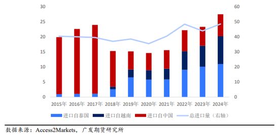 2.以史为鉴——回顾2018年欧盟对华卡客车轮胎实施“双反”措施 根据欧盟官方数据显示,2015年至2024年,欧盟(不包含英国)新的充气橡胶轮胎(欧盟CN编码为4011)进口量从191.3万吨增长至250.6万吨,复合增长率为2.7%,其中,中国为最大进口来源国,占比在32%~41%之间。而此次涉案轮胎约占新的充气橡胶轮胎进口量的55%~61%,最大进口国仍为中国,除中国以外,主要进口来源国为韩国、土耳其、塞尔维亚、泰国等。因此,此次欧盟对华新乘用车和轻型卡车充气橡胶轮胎发起反倾销调查,将对欧盟轮胎市场产生深远影响。 中国是欧盟轮胎进口的第一大来源国,反之,欧盟国家也是中国轮胎出口的重要目的地之一,过去十年,中国出口至欧盟轮胎的数量占中国轮胎总出口量的11%~15%。近十年,中国轮胎在对欧盟出口量的变化趋势上,呈现震荡上行的特点,其中,拐点出现在2018年,这是由于当年欧盟对中国卡车胎征收“双反”税,致使中国对欧盟的轮胎出口量出现断崖式下滑,此外,在2017年后,小客车轮胎成为中国轮胎对欧盟出口的主要产品,约占对欧盟总出口量的70%以上,而出口至欧盟的中国卡客车轮胎占对欧盟轮胎总出口量的比重,在2017年为45%,在2017年后下降至30%以下 上文提到,欧盟对中国轮胎的贸易保护举措由来已久,欧盟曾在2017年8月和10月对中国卡客车轮胎发起“双反”调查,并在2018年5月和11月公布初裁结果和终裁结果。以史为鉴,以下我们将回顾这段历史,并按时间顺序,探究自2018年欧盟对中国卡客车轮胎实施 “双反” 措施以来,对中国卡客车轮胎出口产生的影响:(1)第一阶段,“双反”调查期间(初裁之前),中国卡客车轮胎对欧盟“抢出口”。(2)第二阶段,“双反”初裁以后,中国卡客车轮胎对欧盟出口大幅下滑。2018年,中国卡客车轮胎对欧盟出口量同比下滑48.7%,拖累全年总出口量同比增幅收窄至1%,但也说明中国卡客车出口韧性较强,仍能维持正的同比增速,主要原因是2018年中国对北美、非洲、西亚等地区的出口增量,抵消了对欧盟出口的下滑;(3)第三阶段,2018年“双反”终裁以后,中国卡客车轮胎对欧盟出口量维持低位水平,但总出口量增长趋势不改,且2023年以来对欧洲出口量已恢复与2017年相近的水平。海关数据显示,2017年中国出口欧盟的卡客车轮胎达34.7万吨,占比11.7%;而到2024年,出口量降至21.7万吨,占比仅为4.7%。从2017年至2024年,根据钢联统计,中国全钢胎产能从20225万条/年增长至22310万条/年,产量从13650万条增长至14149万条,复合增长率分别为1.2%和0.4%,随着全钢胎产能扩张,卡客车轮胎出口量同步增长,从336.9万吨增长至458.9万吨,复合增长率为3.9%,出口趋势整体呈现为上升趋势,其中非洲、西亚、东南亚和南美洲等地区以及非欧盟的欧洲国家贡献主要增量。 与此同时,欧盟在对华卡客车轮胎“双反”后,其卡客车轮胎进口格局发生巨大变化——泰国、越南成为承接中国卡客车轮胎出口的主要国家,与2017年相比,2024年欧盟自泰国、越南进口的卡客车轮胎增加了19万吨,而来自中国的卡客车轮胎下降了15.5万吨,表明欧盟自东南亚的进口量弥补了自中国的进口量,此外,2017年至2024年,欧盟卡客车轮胎进口量(欧盟CN编码40112090)从39.9万吨增长至48.4万吨,复合增长率达2.6%。 由此可见,2018年欧盟对华卡客车轮胎的“双反”措施,改变的是中国卡客车轮胎的出口流向,以及欧盟进口的主要贸易伙伴,不变的是中国卡客车轮胎出口量和欧盟进口量的增长趋势。