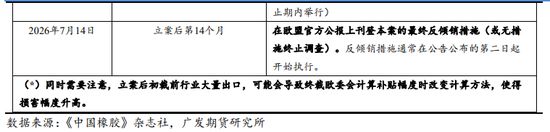 3.欧盟对华轮胎反倾销对橡胶产业链的影响 今年欧盟对华轮胎反倾销调查,对中国小客车轮胎(欧盟CN编码40111000)出口产生的影响最大,这是因为欧盟是中国小客车轮胎的主要出口目的地之一,在2024年,中国小客车轮胎出口至欧盟的数量为83万吨,占小客车轮胎总出口量的25.5%,作为对照,2017年中国卡客车轮胎出口至欧盟的数量为34.3万吨,占卡客车轮胎总出口量的10.2%,这表明今年的反倾销调查结果造成的影响要明显大于2018年。 由于欧盟宣布:反倾销初裁结果公布时间由2025年11月21日推迟至2025年12月23日;初裁实施时间由2025年12月21日推迟至2026年1月21日;终裁实施时间由2026年6月19日推迟至7月18日。在初裁结果公布之前的调查期间,根据2018年欧盟“双反”的经验,我们预计2025年6-10月会出现中国小客车轮胎对欧盟“抢出口”,同时导致出口需求前置,或使得2025年11-12月出口增速放缓。假设初裁结果是对华轮胎征收高额反倾销税,则从2026年1月起,中国小客车轮胎对欧盟出口量或将明显下降。那么,我们不禁要问两个重要问题:(1)中国小客车轮胎总出口量是否会下滑?然后,哪些地区可以填补对欧盟出口的下滑?(2)哪些国家可以代替欧盟自中国进口的差额? 对于以上问题(1),我们认为中国小客车轮胎年出口量在2026年大概率会下滑,但俄罗斯、拉美国家、非欧盟的欧洲国家以及西亚国家等,将逐步填补对欧盟出口的下滑,中国小客车轮胎出口量长期增长趋势不变。2018年欧盟“双反”事件后,2018~2024年中国出口至欧盟的卡客车轮胎数量较2017年下滑幅度在37%~62%。因此,假设当此次反倾销的结果是征收中国轮胎高额反倾销关税,且中国小客车轮胎对欧盟年出口量较2024年下滑37%,即减少30.7万吨,而近三年中国对非欧盟国家的小客车轮胎出口量年平均增长量为21万吨,且今年1-7月对非欧盟国家的出口量同比下滑0.6%,因此,中国小客车轮胎年出口量在2026年大概率会下滑。 对于问题(2),我们认为部分差额将由亚洲国家(不含中国)、土耳其和塞尔维亚代替。2024年,欧盟小客车轮胎进口的前十大来源国为:中国,韩国,土耳其,塞尔维亚,日本,泰国,印度,英国,印度尼西亚,菲律宾,其中,自中国进口量为78.7万吨,自其余九国进口量合共为50.7万吨,这充分说明中国在欧盟小客车轮胎进口市场处于绝对的领先地位,若欧盟自中国进口量存在明显减量,则欧盟总进口量将下滑。 根据对以上问题的思考,我们进一步分析对橡胶产业链中上游的影响:(1)天然橡胶方面,由于轮胎贸易流向的变化,东南亚天然橡胶消费量将增加,且东南亚天然橡胶对欧洲出口量增加,但对中国出口量是否因此减少,有待进一步观察;(2)合成橡胶方面,韩国合成橡胶消费量将增加,使得韩国丁二烯消费量增加,考虑到中韩两国互为双方的丁二烯主要贸易伙伴,所以,或导致韩国丁二烯净进口增加,而中国丁二烯净出口增加。另外,中国对东南亚和欧洲的合成橡胶出口量将增加。