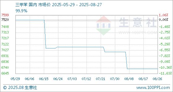 8月27日,生意社三甲苯基准价为6725.00元/吨,与本月初(7000.00元/吨)相比,下降了3.93%。