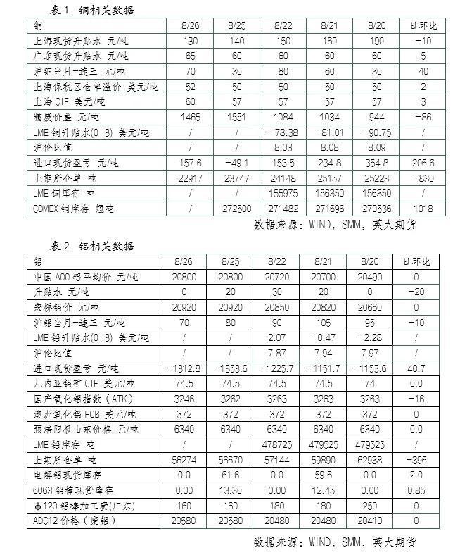 来源:市场资讯 (来源:英大期货) 摘要: 美元指数走高,令铜铝价格有所承压。市场逐渐消化美联储主席鲍威尔讲话,在通胀上行风险增加和就业市场疲软的当下,市场在等待新的通胀和非农数据等信息,为美联储利率决策提供更多的支撑。并且,特朗普宣布解雇一名美联储理事,向美联储施压,加剧人们对美联储独立性的担忧。铜方面,供应增量有限,消费边际改善,助力电解铜去库,但铜价走高抑制下游消费,增加累库压力。铝方面,供应端变化不大,消费边际改善,但整体仍处于淡季氛围,铝价反弹抑制下游消费,电解铝仍有累库压力。 今日铜铝震荡回落。截至8月26日收盘,沪铜主力CU2510合约收报79190元/吨,跌500元/吨,跌幅0.63%。沪铝主力AL2510合约收报20715元/吨,跌55元/吨,跌幅0.26%。 宏观消息面,当地时间8月25日,美国总统唐纳德·特朗普宣布解雇美联储理事丽莎·库克。据仟茂财经讯,据外媒报道,美国总统特朗普签署文件罢免美联储理事库克,立即生效。此举史无前例,标志着他对美联储攻势的重大升级。这将美联储推向前所未有的局面,并可能引发一场最终闹到最高法院的法律冲突。素有“美联储传声筒”之称的《华尔街日报》记者Nick Timiraos引用专家的话表示,特朗普罢免库克此举本质昭然若揭,这是一场公然的勒索,也是试图向政策制定者施压、迫使其降息的行径。 此外,中新网8月26日电 据彭博社报道,当地时间25日,美国国土安全部发布的一份草案通知,概述了美国政府将对印度产品征收50%关税的计划。通知称,加征的关税将适用于“自2025年8月27日美国东部夏令时间0时起,报关提货或从仓库提货的印度商品”。 铜方面,据SMM讯,部分铜线缆企业反馈,昨日铜价冲高至79500元/吨上方后维持高位,终端下游订单承接力度显著减弱,行业消费端呈现疲软态势,整体接单节奏同步放缓。现货市场方面,目前铜价居高,下游买盘减弱,但近月时而出现Contango结构令持货商亦不愿低价出货。8月26日,SMM 1#电解铜现货对当月2509合约报升水80-升水180元/吨,均价报价升水130元/吨,较上一交易日下降10元/吨;SMM1#电解铜价格79480~79690元/吨。广东地区库存6连降持货商继续挺价,但下游不愿多采购,整体成交一般。 铝方面,消费淡季下需求仍偏弱。华东地区,市场对后续现货升水持有一定的看跌情绪,持货商积极出货为主,下游采购情绪较弱。中原市场,铝价绝对价高企,下游接货乏力,成交清淡。8月26日,SMM A00铝报20780元/吨,较上一交易日持平,对09合约平水,较上一交易日下跌20元/吨。 总的来看,美元指数走高,令铜铝价格有所承压。市场逐渐消化美联储主席鲍威尔讲话,在通胀上行风险增加和就业市场疲软的当下,市场在等待新的通胀和非农数据等信息,为美联储利率决策提供更多的支撑。并且,特朗普宣布解雇一名美联储理事,向美联储施压,加剧人们对美联储独立性的担忧。铜方面,供应增量有限,消费边际改善,助力电解铜去库,但铜价走高抑制下游消费,增加累库压力。铝方面,供应端变化不大,消费边际改善,但整体仍处于淡季氛围,铝价反弹抑制下游消费,电解铝仍有累库压力。