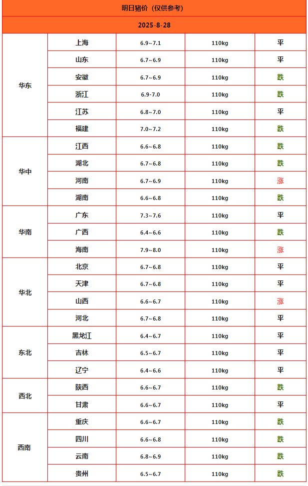 在需求方面,8月份,消费需求缓慢回升,上旬,受副高影响南北高温持续,需求跟进不佳,但是,立秋后,需求支撑缓慢回升!且,南北地区升学宴增多,下游白条购销需求有所改善,国内屠企开工率逐步回升!不过,进入月末,市场普遍预估,学生返校前,下游市场集中备货,屠企开工率或大幅提升,但是,实际来看,下游购销较为谨慎,样本屠企开工率在29%,相比前一日下降0.23个百分点,需求跟进不及预期!消费对于猪价支撑有限! 因此,8月份,生猪供需呈现“双增”的局面,但是,碍于供应水平显著提升,养殖端减重出栏情绪较高,且,生猪跨区调运更加严苛,月末,养殖端有超预期出栏的现象!反观需求方面,虽然,屠企开工率略有回升,但是,增幅较为有限,供应增量大于需求增速,二育入场也较为谨慎,猪价基本面略显偏空! 据数据显示,受屠企调价,预计,8月28日,外三元标猪报价跌至13.65元/公斤,后市关注屠企开工率的变化以及集团猪企出栏节奏的变化!个人认为,月末,猪价仍存止跌上涨的机会! 国内南北各省区生猪价格一览表: