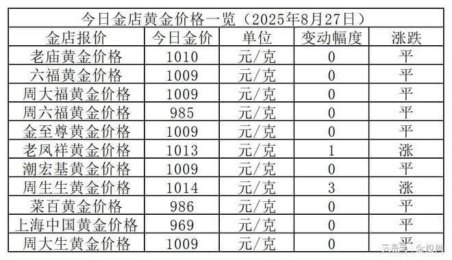 8月27日国内黄金市场动态:国内品牌金店金价整体持稳,部分金店继续上涨,黄金回收价大涨。其中,周生生上涨3元/克,报1014元/克,为新的最高价金店。上海中国黄金价格不涨不跌,报价969元/克,还是最低价金店。今日的金店高低价差扩大至45元/克。 具体各大品牌金店最新价格见下表格: