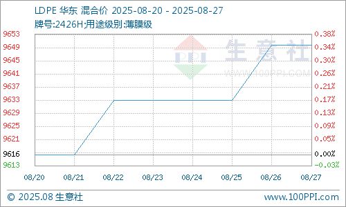 据生意社商品行情分析系统监测,LLDPE(7042)8月20日均价7433元/吨,8月27日均价在7451元/吨,上涨0.25%。LDPE(2426H)8月20日均价9616元/吨,8月27日均价在9633元/吨,上涨0.17%。HDPE(2426H)8月20日均价8000元/吨,8月27日均价在8000元/吨,报价持平。 近期聚乙烯行情窄幅运行为主,上涨空间有限。供应端,临近月底,现货资源将会减少,预售增加。需求端,正从淡季向旺季过渡,需求有所好转,农膜行业开工率回升,但市场反弹后成交跟进谨慎,限制价格上行空间。成本端,8月26日,国际原油期货收跌,成本端支撑松动。政策面对聚乙烯底部有一定的支撑。 短期供应压力有所缓解;9月即将进入需求旺季;国内政策面支撑;成本支撑松动,预计聚乙烯震荡偏强走势为主。 |