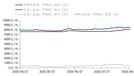 与豆油相比,东北地区玉米毛油到厂价格优势较为明显,在价格合适情况下饲料厂会优先考虑采购玉米油替代豆油。