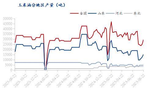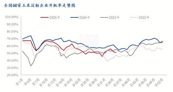 一、成本供应端 据Mysteel农产品调查数据显示,目前玉米淀粉行业检修与复产企业均有,本周期整体表现行业开机率小幅下滑。本周(2025年8月21日-8月27日)全国玉米加工总量为53.93万吨,较上周减少0.97万吨;周度全国玉米淀粉产量为26.39万吨,较上周产量减少0.67万吨;周度开机率为51.01%,较上周降低1.3%。截止发稿日玉米淀粉当日开机率为54.39%)受主产品玉米价格仍处相对高位影响,玉米深加工持续处于亏损状态,故而短期开机率仍难有所好转。企业周度玉米胚芽招标结果来看,短期胚芽价格持续高位,短期内预计下调空间有限,预计至少要9月中旬左右有下行空间。
