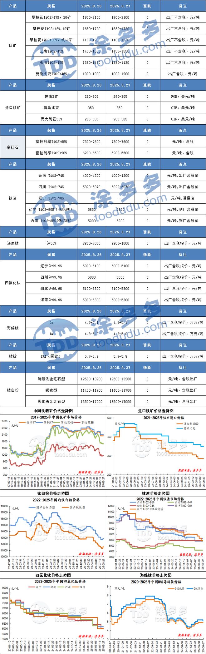来源:市场资讯 (来源:钛资讯) 今日攀西钛矿价格指数1931.25,较昨日持平。钛矿市场整体维稳,供应暂无较大变化,新单仍僵持,价格继续坚挺。 钛渣 本月北方企业90高钛渣招标价格5850元/吨,较上月价格下调450元/吨;下游需求疲软,高钛渣弱稳运行。 四氯化钛 四氯化钛市场报价5000-5500元/吨,下游市场偏弱,市场出货压力依旧较大,企业压价情绪浓,四氯化钛价格混乱,市场外供量有所减少。 一级海绵钛民品报价至4.8-5.0万元/吨左右,市场部分0级海绵钛报价5.0-5.1万元/吨左右。企业出货压力较大,市场出现低价货源,海绵钛供需关系仍失衡。 今日钛白粉价格指数13243.89,较昨日持平。原材料成本依旧较高,工厂生产压力较大,企业目前多处于观望阶段。近日个别工厂受天气不可抗力因素影响,工厂现货偏紧,加之在手订单,部分企业排单发货。 二、钛价格汇总