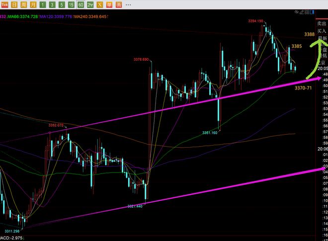 第三,黄金小时线级别:隔夜强势收盘于高位,那么今日一般都是继续等回踩看涨;由于日内白盘总容易进行来回扫荡,美盘才会有相对好的延续拉升力,因此早间是不宜追涨,相反若一早先出现一波急拉释放隔夜拉升力度,那么是可以先尝试看跌回落一波,因为一早延续性都相对较差;可惜,它并未出现一早急拉,而是直接连阴回测,一直等触及66日均线3375上出现一些企稳信号,则按计划靠拢3370上方去尝试继续看涨,欧盘拉升至3385,然后冲高回落,这意味着今日10米运行范围应该是3373-3385,之所以无法干脆拉升破高,主要在于美元的短线拉升强势,以及黄金短周期的背离; 今晚从图中通道分布来看,紫色通道上轨支撑上移至3370-71, 66日均线依然支撑于3374-75,这两处位置都可继续尝试看涨,短期阻力先看3385-3388,突破站上3388才能进一步试探3394,乃至3400之上;