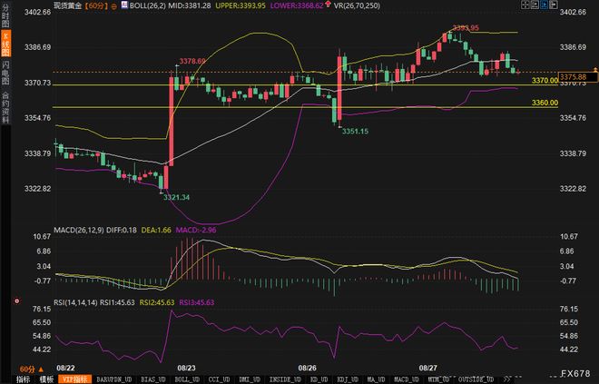 基本面 第一,政策独立性与利率预期。美联储理事Lisa Cook离任引发的法律与程序性争议持续发酵,总统方面表态将面对潜在诉讼并遵循法院判决,但外界关注点已转向央行治理与独立性预期的再定价。市场解读是:若管理层人事与政策沟通受到更强的外部压力,利率路径更易向宽松倾斜。期货市场的概率反映了这种变化——此前定价指向“9月降息25个基点”的可能性约80%,最新跟踪显示“至少降息25个基点”的概率已超过87%,较前一日的84%继续抬升。利率下行通常压低非孳息资产的持有机会成本,从而对金价构成结构性支撑。 第二,外部不确定性与贸易摩擦敏感点。美国方面称与印尼的相关协定短期内难以达成,部分商品关税存在从25%翻至50%的风险;而印度尼西亚方面在多项原材料上获得了豁免,这种“选择性豁免+潜在加倍”的组合让关税路径更具不确定性。对黄金而言,任何可能推高全球供需错配、抬升风险溢价与波动率的消息,都会提升其在多元资产配置中的避险权重。 第三,美元与债券的跷跷板。尽管围绕央行独立性的讨论对美元理论上偏负面,但外汇层面的即时反应相对克制:一方面,Cook的法律挑战进入程序期,短期难以改变委员会的投票格局;另一方面,近期美国经济数据——如消费者信心与耐用品订单——好于预期,令美元获得一定支撑,叠加30年期美债的相对弱势,期限利差结构并未出现单边化的“惊险走样”。也因此,黄金的驱动更像是“政治—政策风险溢价”和“利率终点下移”的共振,而非单纯的美元单边走弱。 展望本周余下时间,二季度年化GDP修订值与7月核心PCE(美联储偏好的通胀口径)将成为关键数据窗口。若GDP被下修而核心PCE继续回落,市场对年内累计降息的想象空间将被进一步放大;反之,若核心价格黏性上行,黄金短线将面临“利率重定价”的回撤压力。 技术面: 本轮上行发端于3321.34一线的长实体阳线,随后快速拔高至3378.69并进入横盘趋势。其后出现一次快速回撤在3351.15获得买盘,继而震荡上攻至3393.95附近;目前价格回落至布林中轨一带,最新围绕3375.88运行。布林带中轨3381.28,上轨3393.95,下轨3368.62。带宽经历“先扩后收”,短线呈温和收敛的布林带挤压形态,意味着市场波动率有二次释放的蓄势迹象。