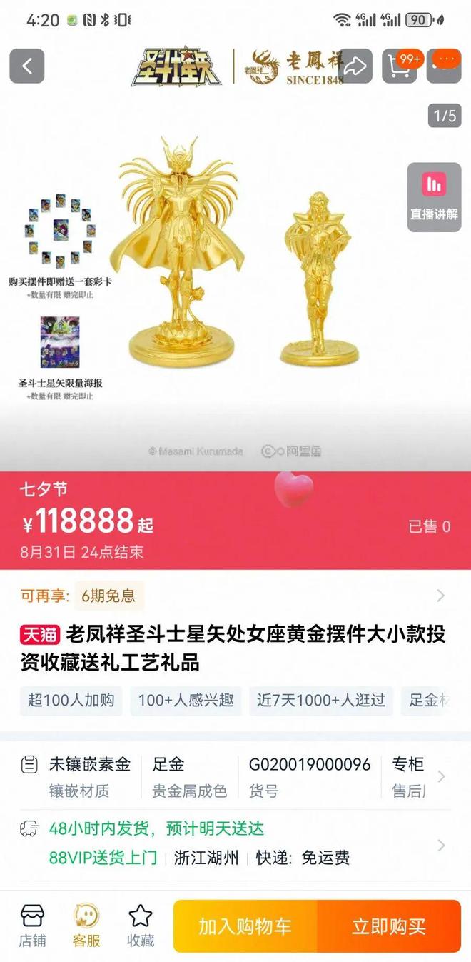部分联名黄金产品 图/21世纪经济报道 边万莉摄 在众多的IP中,圣斗士星矢承载了80后的美好回忆。记者在商场看到,老凤祥与圣斗士星矢的联名金卡,0.01g售价达到了600多元。在线上商场,2g重的十二星座在七夕节售价2580元,最为出圈的圣斗士星矢摆件,88g重售价达到11万多,666g售价88万余元。 “相比于传统的金饰,‘痛金’造型更好看。”00后张超(化名)告诉记者,选择“痛金”最主要是对IP的喜欢,而且变现比其他“谷子”(在二次元文化中,特指IP衍生出的周边产品)可能会更方便。二次元爱好者王静(化名)也向记者表达了类似的观点,“从我个人来讲,只要我还热爱这个角色,那它的存在就一直是有价值的,甚至要比付出的金钱更高。” 赵芳表示,“我目前其实更多是在工作之余来以放松为目的玩游戏,购买痛金一是觉得在个人接受范围内囤黄金哈哈哈,二是既然打算囤黄金了,再稍微溢价一些带自己喜欢的角色也挺好的。”