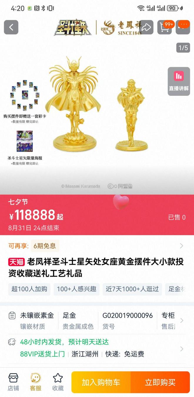 在众多的IP中,圣斗士星矢承载了80后的美好回忆。记者在商场看到,老凤祥与圣斗士星矢的的联名金卡,0.01g售价达到了600多元。在线上商场,2g重的十二星座在七夕节售价2580元,最为出圈的圣斗士星矢摆件,88g重售价达到11万多,666g售价88万余元。 “相比于传统的金饰,‘痛金’造型更好看。”00后张超(化名)告诉记者,选择“痛金”最主要是对IP的喜欢,而且变现比其他“谷子”(在二次元文化中,特指IP衍生出的周边产品)可能会更方便。二次元爱好者王静(化名)也向记者表达了类似的观点,“从我个人来讲,只要我还热爱这个角色,那它的存在就一直是有价值的,甚至要比付出的金钱更高。” 赵芳表示,“我目前其实更多是在工作之余来以放松为目的玩游戏,购买痛金一是觉得在个人接受范围内囤黄金哈哈哈,二是既然打算囤黄金了,再稍微溢价一些带自己喜欢的角色也挺好的。”