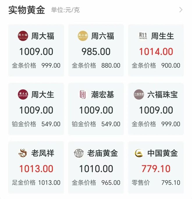 实物黄金方面,国内多数品牌黄金首饰克价已突破1000元/克。