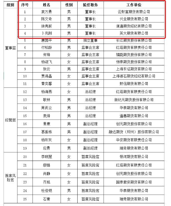 【导读】4家期货公司更换一把手 中国基金报记者 孙越 又见期货公司董事长职位大变动! 近日,中国期货业协会发布《2025年8月26日期货公司高管人员专业能力水平评价测试合格人员名单》,云财富期货拟任董事长袁万勇、兴业期货拟任董事长陈文奇、道通期货拟任董事长徐亮前、英大期货拟任董事长卜兆刚通过测试。