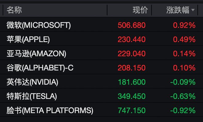 大型科技股多数上涨,英特尔涨超2%,微软涨近1%,苹果、谷歌、亚马逊小幅上涨;特斯拉、英伟达、脸书小幅下跌。