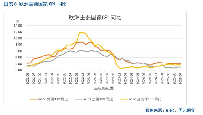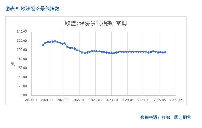 截至 2025年7月,欧元区 HICP 同比通胀率为2.0%,与6月持平;欧盟整体通胀2.4%(较6月的2.3%小升)。从构成看,食品、酒精及烟草同比增长3.3%(6月 +3.1%),服务 价格同比增长3.2%(6月 +3.3%)、非能源工业品同比增长0.8%(6月 +0.5%),能源价格同比下降2.4%(6月 -2.6%)。按贡献度分解,服务贡献1.46个百分点、食品贡献0.63个百分点、非能源工业品贡献0.18 个百分点,能源贡献-0.23个百分点;核心通胀(剔除能源与食品、酒精、烟草)同比增长2.3%。 经济景气方面,最新已发布的 ESI 为2025年7月:欧元区 95.8(环比+1.6点),仍低于长期均值100;就业预期指数(EEI)97.5(环比+0.3 点)。分项上,工业(+0.9)与服务(+0.7)同步改善,零售(+0.8)走强,建筑(-0.6)回落;消费者信心当月小幅回升(+0.3)。