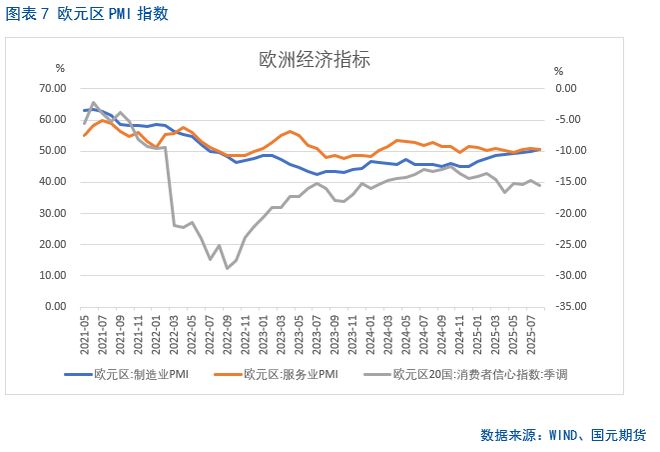 四、欧洲经济 截至2025年8月(8月21日公布的“预览值/Flash”),欧元区PMI整体继续走强:综合PMI升至51.1,为15个月高点;制造业PMI升至 50.5,自2022年中以来首次重返50以上,显示产出回升已由制造端带动;服务业PMI预览值为50.7。调查同时显示,新订单在 8 月回到扩张区间,是 2024年5月以来首次“净增长”;价格端总体仍偏温和,商品售价略有下行,对服务端相对温和的涨价形成对冲。这些数据为“温和扩张”而非强劲复苏定下基调。 消费端情绪在8月出现回落。欧盟委员会闪估显示,欧元区消费者信心指数降至-15.5(较 7 月下降0.8个百分点),欧盟整体为-14.8(环比下降0.3个百分点),两者均明显低于长期均值,反映居民对收入前景与宏观环境仍偏谨慎。该结果发布于8月21日,属于月度“快速估计”。