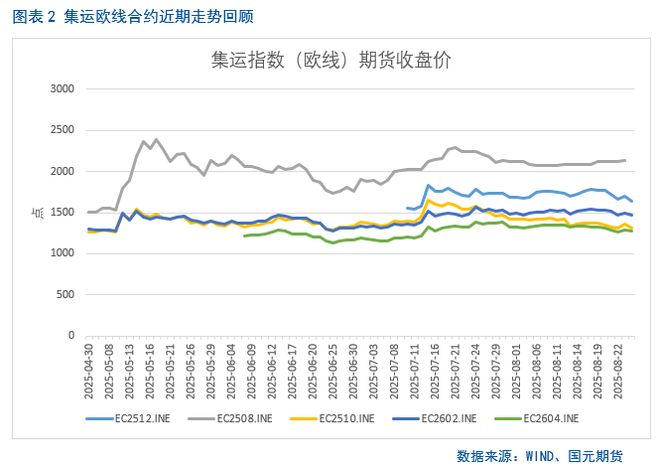 来源:市场资讯 来源:国元期货研究 8月份,集运欧线10月主力合约整体呈现震荡走低趋势,当前航运旺季进入尾声,航运公司持续调降运费报价。截至8月26日,主力合约累计下跌超6%。近期航运公司降价节奏基本符合预期,同时期货目前大幅贴水现货,本周集运欧线以震荡行情为主。 地缘政治方面,以色列方面迄今尚未就加沙地带停火谈判调解方的提议作出正式回应。卡塔尔公开呼吁国际社会向以色列施加压力,敦促其尽快给出明确答复。7月6日起,哈马斯与以色列在卡塔尔首都多哈开启新一轮间接谈判。由于不满哈马斯对停火方案提出的意见,以方已于7月24日召回谈判人员,转而评估“替代选项”。8月8日,以色列方面提出以军接管加沙地带北部加沙城的计划,地面态势面临进一步升级的风险。在航运层面,这意味着红海相关不确定性难以快速消退,航司绕行好望角与动态风控仍将作为基准情景与常态选项。 当前航运报价持续走低:马士基wk37报价下跌至1900美金;欧线9月初大柜平均报价在2200美金附近。同时当前运力充足,空班比例偏低。旺季之后需求有边际转弱预期。若后续各航司9月报价快速走低,仍将对目前10月合约估值形成一定压力。但目前主力合约较现货指数已大幅贴水,大幅下跌空间或不大。 一、期货行情回顾 8月份,集运欧线10月主力合约整体呈现震荡走低趋势,当前航运旺季进入尾声,航运公司持续调降运费报价。截至8月26日,主力合约累计下跌超6%。近期航运公司降价节奏基本符合预期,同时期货目前大幅贴水现货,本周集运欧线以震荡行情为主。