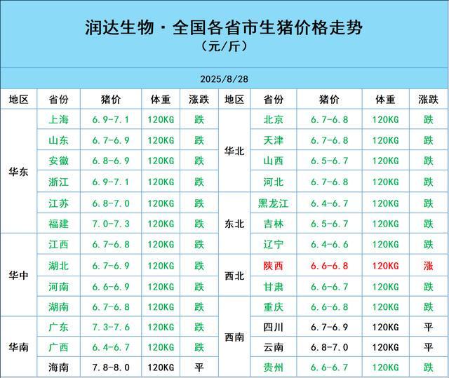 一、2025年8月28日明日猪价行情 整体趋势:普遍下跌 全国绝大部分省份猪价呈现下跌趋势,仅陕西微涨,海南、四川、云南保持平稳。 跌幅普遍在0.1–0.3元/斤之间,市场情绪偏空。 区域价格对比 高价区:海南(7.8–8.0)、广东(7.3–7.6)、福建(7.0–7.3); 低价区:黑龙江、辽宁(6.4–6.6)、山西、广西、贵州(6.4–6.7); 南北价差明显,南方价格整体高于北方。 二、行情影响因素分析