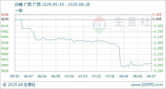 8月28日,生意社白糖基准价为5960.00元/吨,与本月初(6036.67元/吨)相比,下降了1.27%。